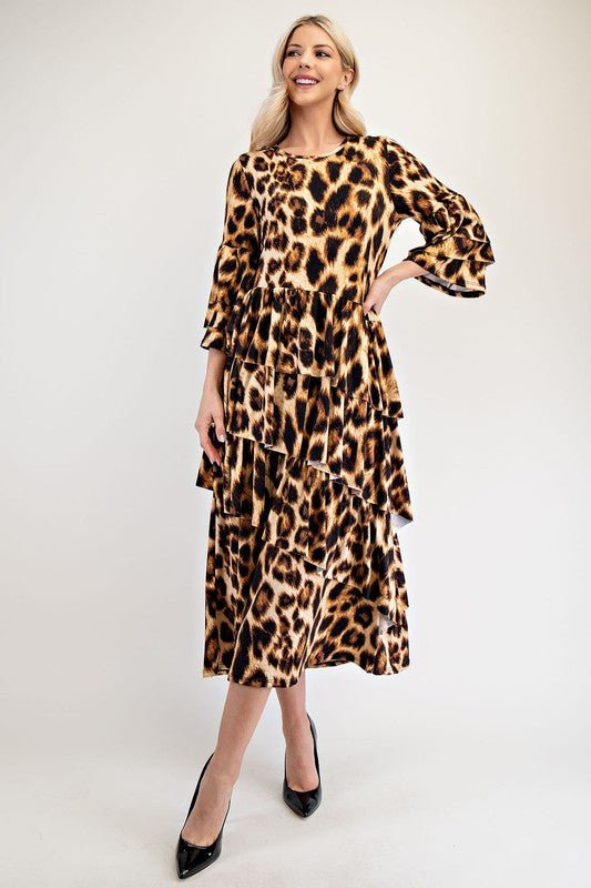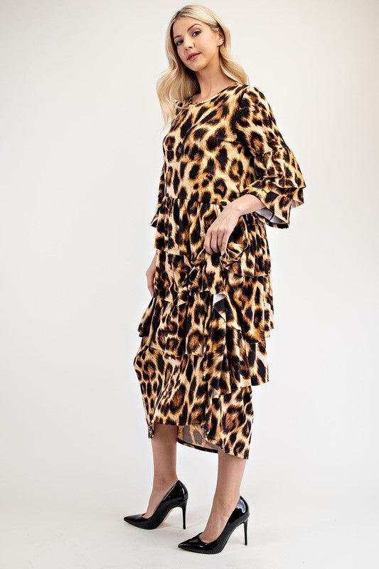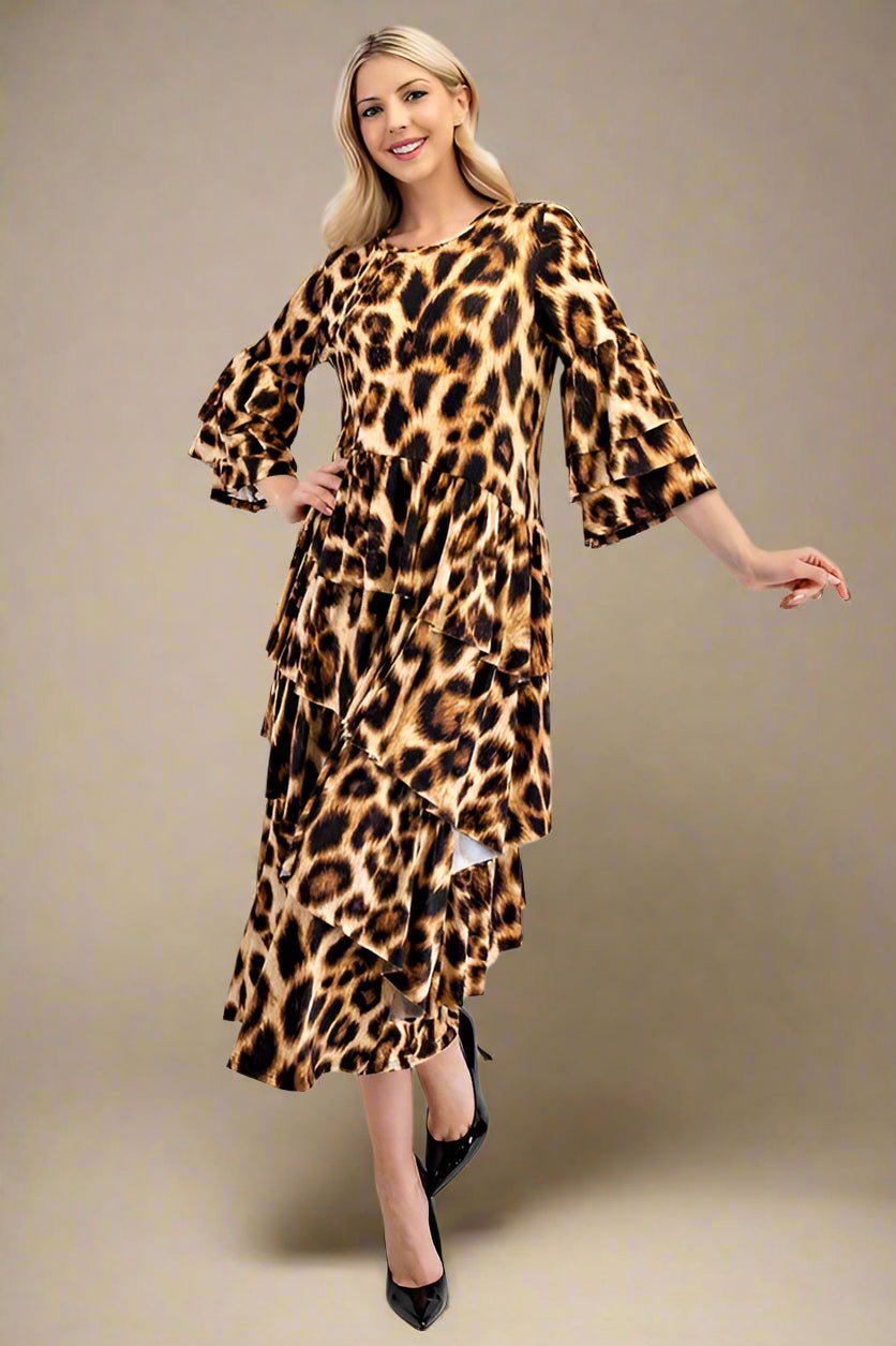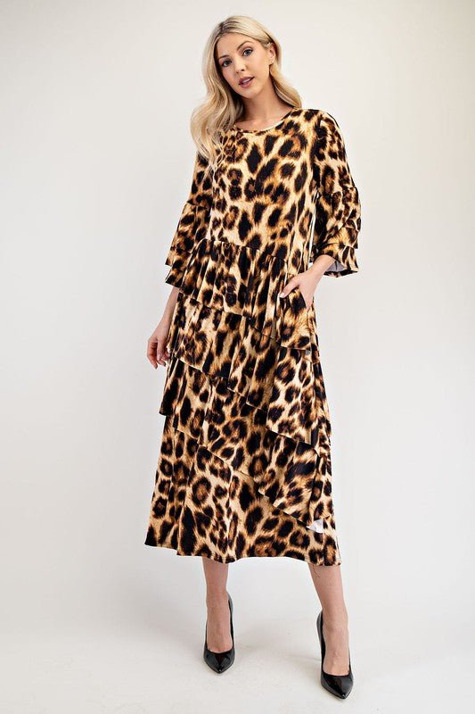 Pounce on this purr-fect midi dress! It's sure to be the cat's meow with its stretchy fit, convenient pockets, and available plus sizes. A fierce, leopard print design and playful ruffle details add some extra flair to your wardrobe. Don't miss out on this wildly stylish dress!