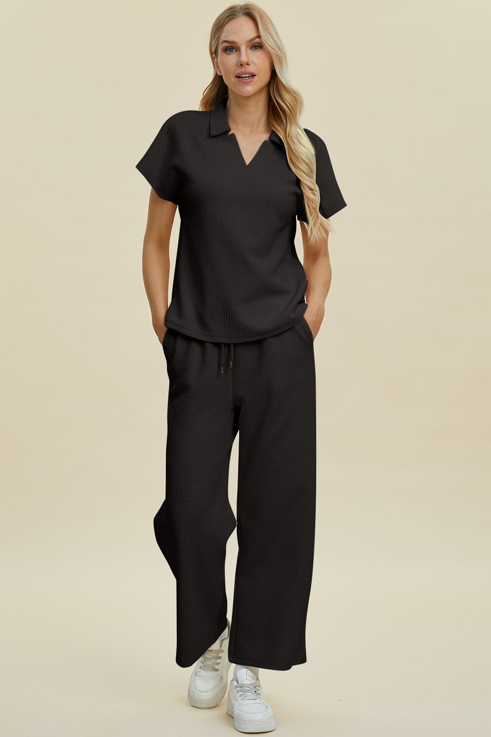Feel effortlessly chic and comfortable in our Collared Short Sleeve Top and Pants Set. Featuring light stretch fabric and convenient pockets, this set comes in both cream and black and is available in plus sizes. Ideal for everyday wear with a touch of sophistication.