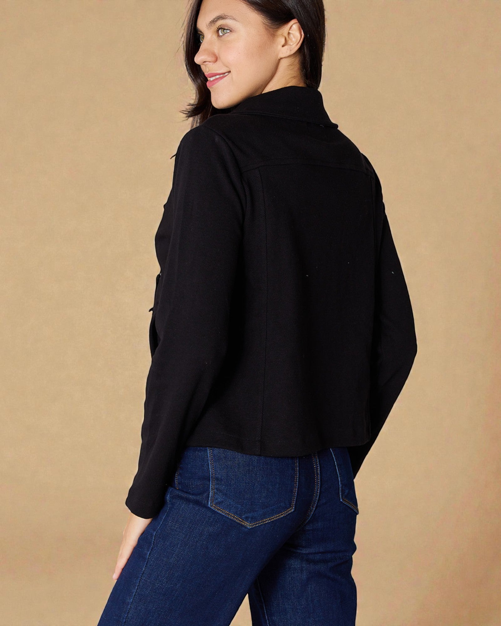 Effortless edge meets everyday comfort in this black asymmetrical zip jacket. Crafted from a soft cotton blend, it drapes beautifully while keeping you cozy through layering season. Functional pockets keep your essentials close, and the modern asymmetrical zip adds just enough attitude to elevate any outfit. Available in plus sizes so everyone can rock this versatile staple.