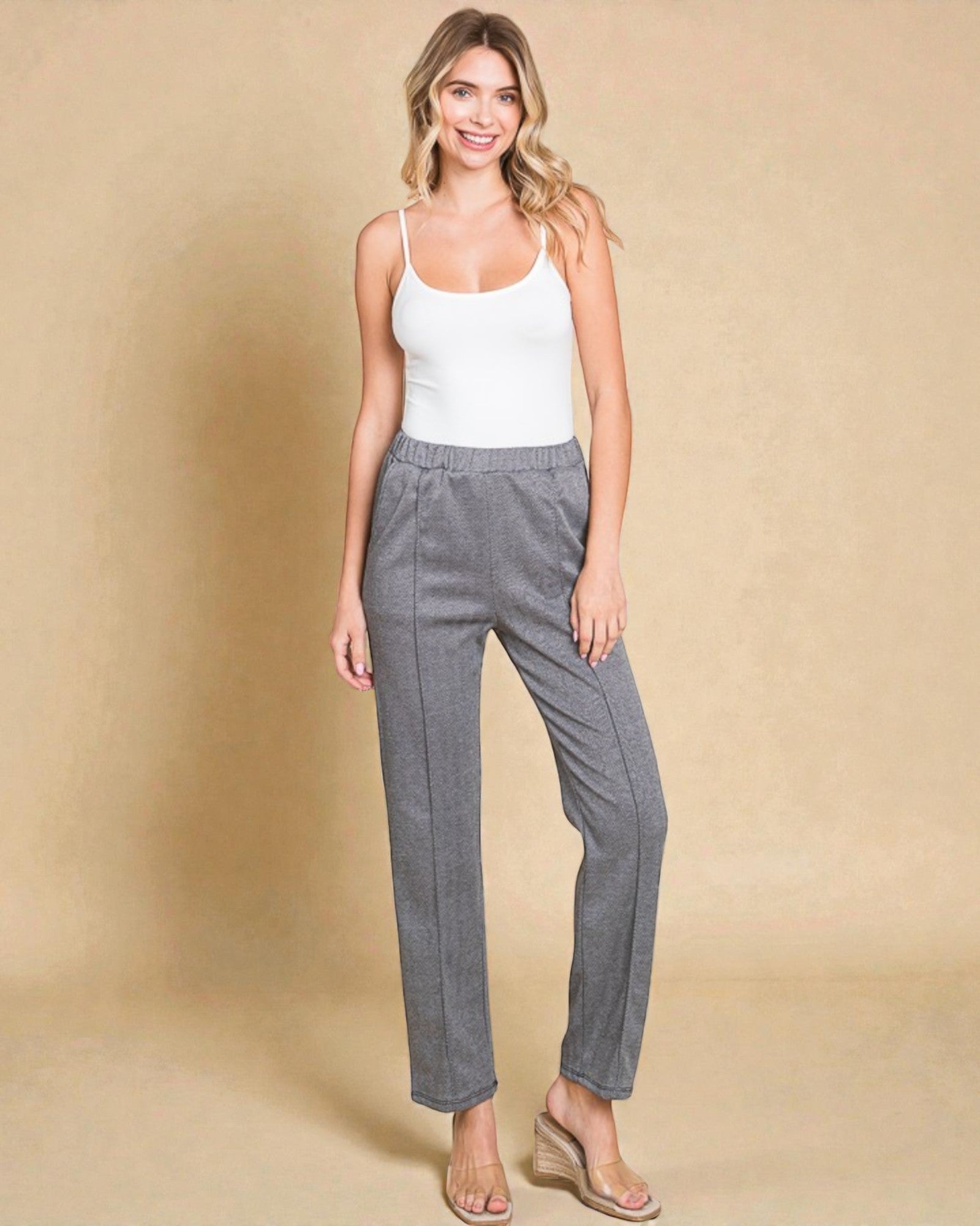 Comfort meets style in these heather gray straight-leg pants, designed with a flattering front seam that elongates your silhouette. The elastic waist keeps you cozy without sacrificing polish, making them perfect for everything from casual Fridays to relaxed weekends. Available in plus sizes, so everyone can enjoy that effortless, put-together vibe. Slip them on and feel the difference quality construction makes.
