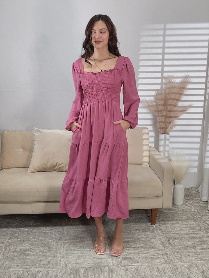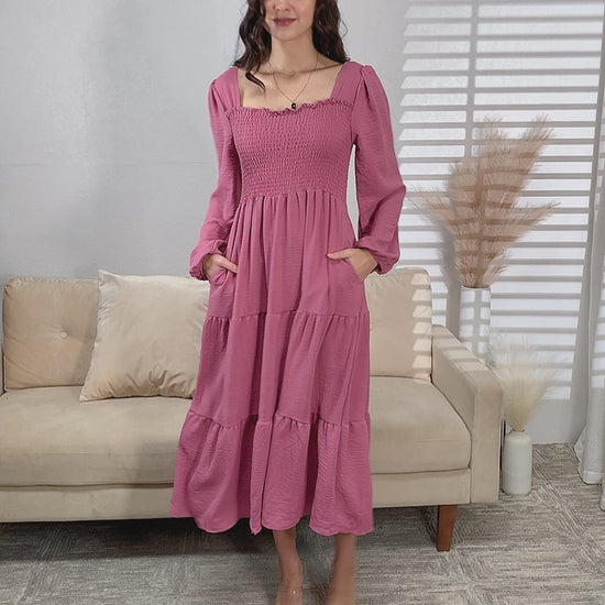 Rose Smocked Long Sleeve Midi Dress