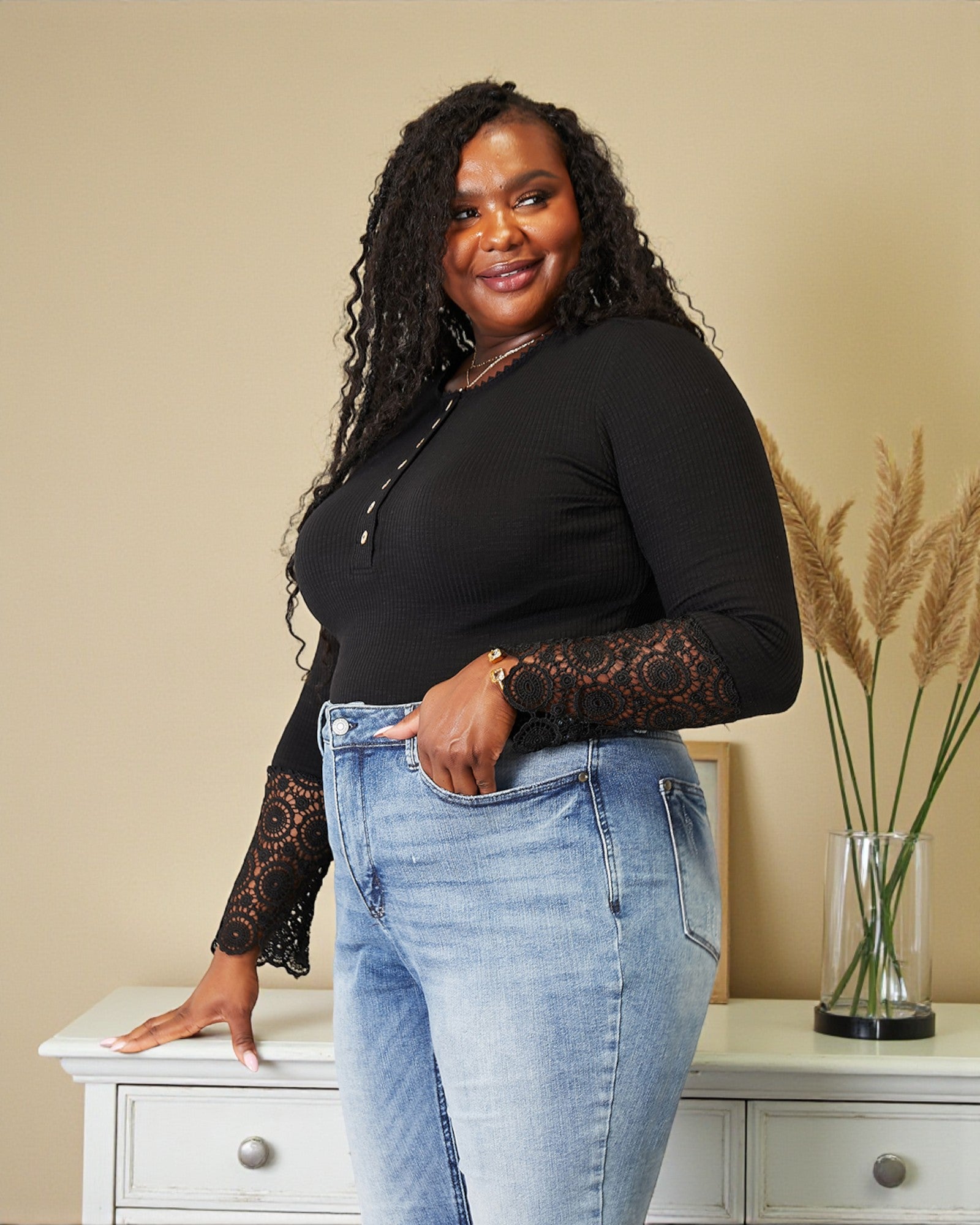 Effortless elegance meets cozy comfort in this Black Ribbed Henley Top, where a classic fitted silhouette gets a playful twist with delicate crochet lace sleeves. The long sleeves offer warmth and coverage, while the intricate lace detailing adds texture and visual interest—perfect for layering or wearing solo.