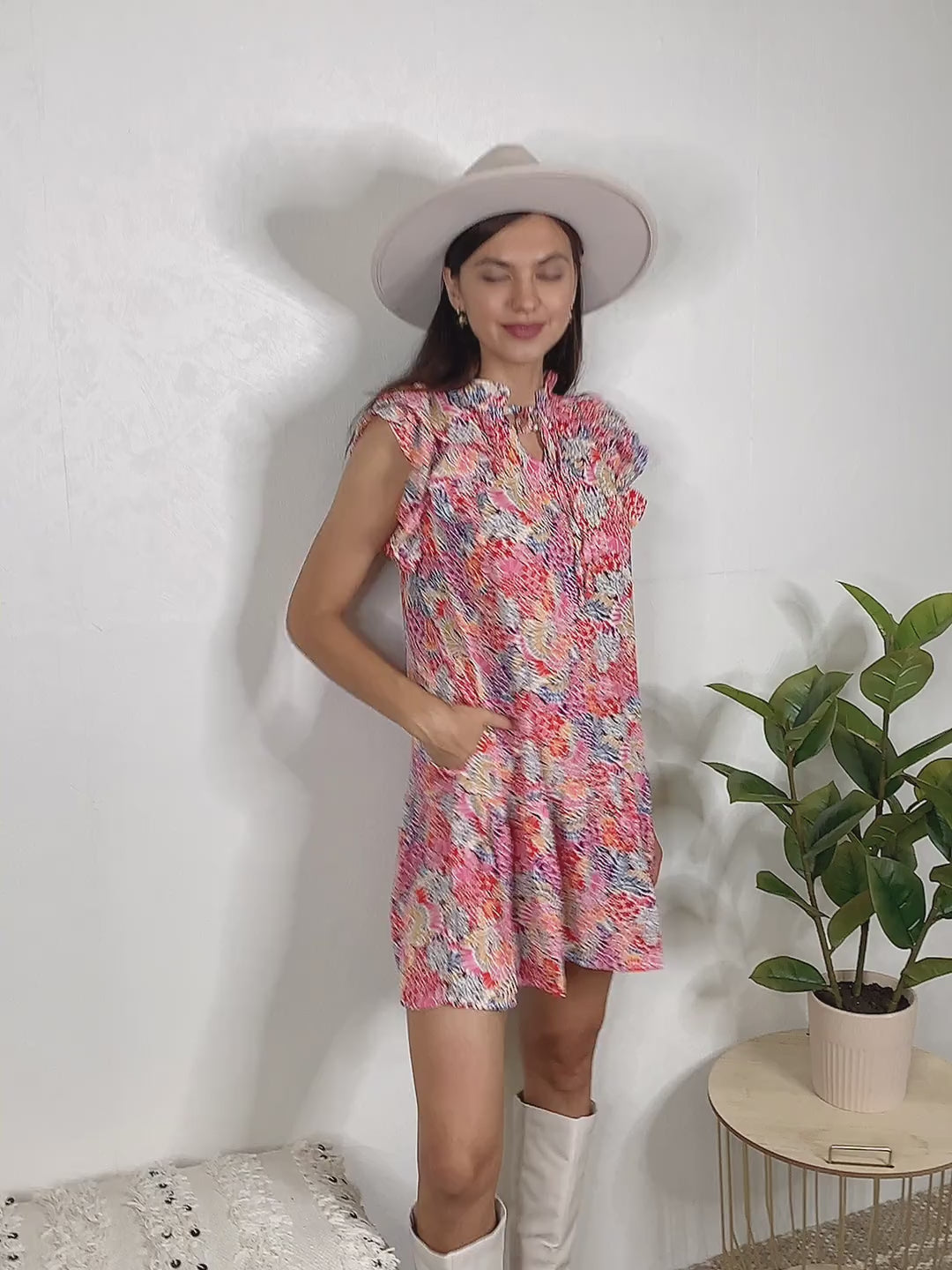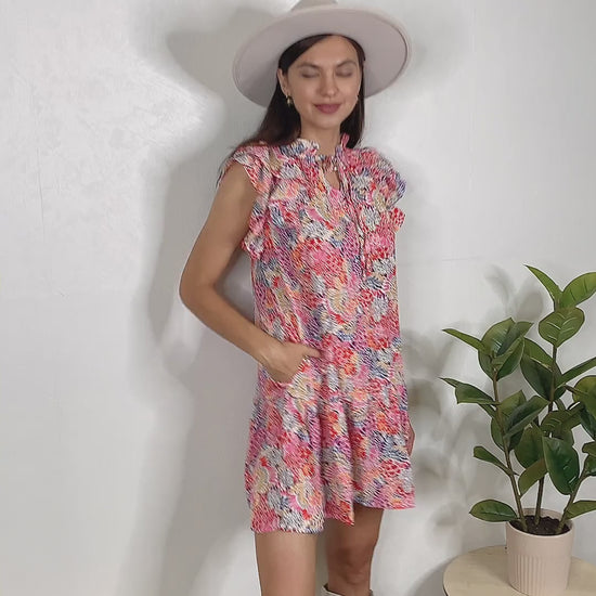 Twirl into the season in this charming pink floral mini dress, complete with delicate ruffle sleeves and a chic keyhole neckline. The best part? Functional pockets keep your essentials close while you move through your day with ease. Perfect for brunch dates, garden parties, or whenever you want to feel effortlessly put-together with a playful edge.