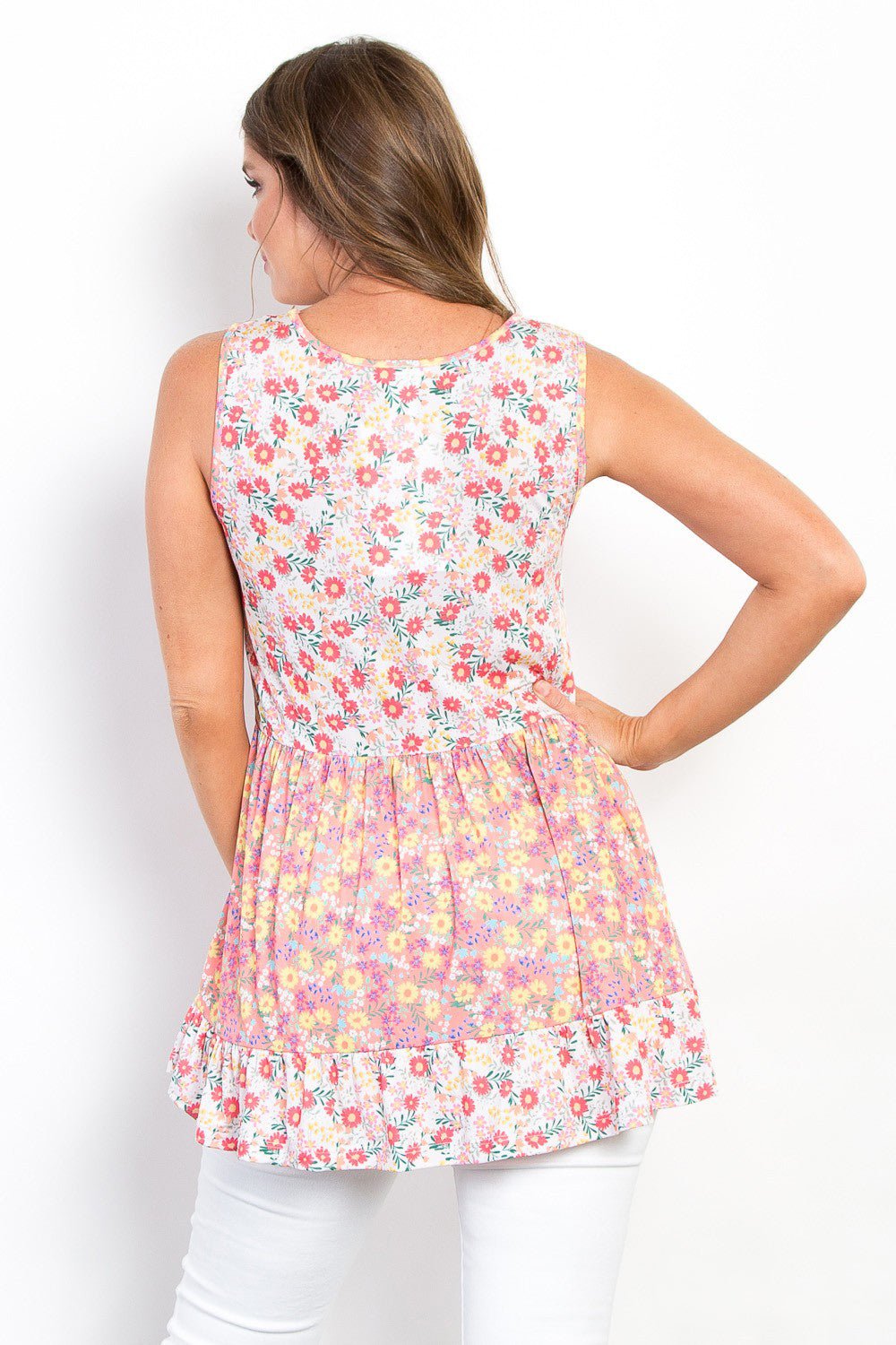 Twirl into spring with this charming pink mixed floral tank top! Featuring a delicate ruffle hem that adds a flirty touch, this piece is perfect for layering or wearing solo on warm days. The vibrant floral print brings instant personality to any outfit, while the soft fabric keeps you comfortable all day long. Plus sizes available to celebrate every body type!