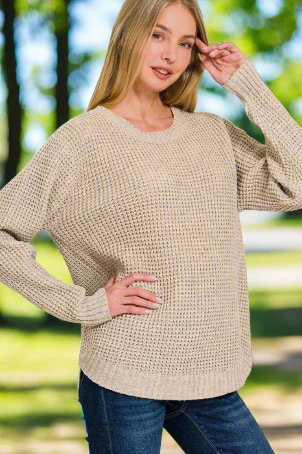 Cozy up in our Oatmeal Waffle Knit Sweater—the perfect excuse to embrace your softest self. This lightweight layer features a textured waffle knit that's as tactile as it is timeless, making it ideal for layering or wearing solo. The neutral oatmeal tone pairs effortlessly with everything in your closet, while the relaxed fit keeps comfort at the forefront.