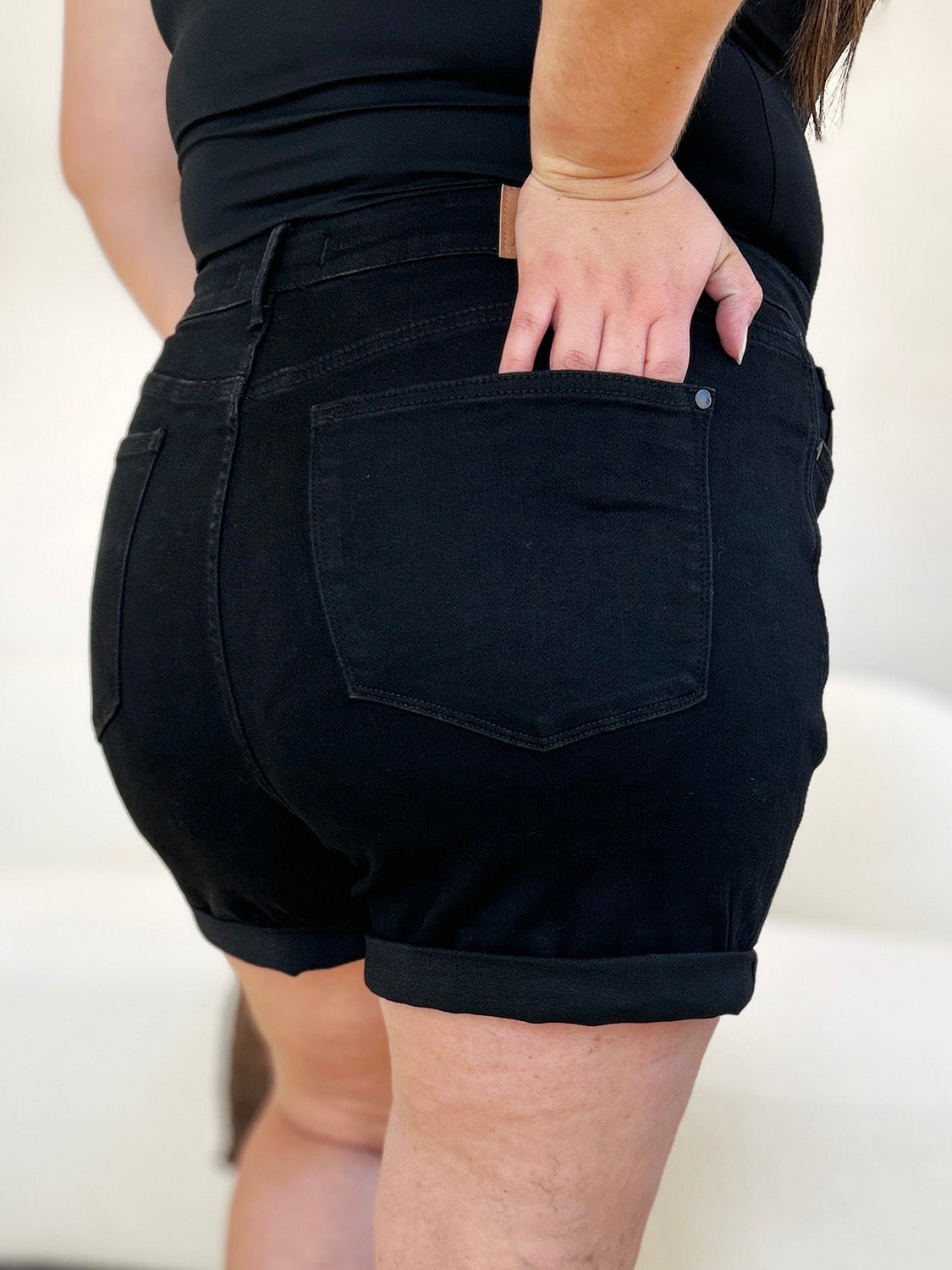 Black High Rise Cuffed Denim Shorts Rock these classic denim shorts with a modern twist! Crafted from a comfy cotton blend with just the right amount of stretch, they move with you all day long. The high rise cut pairs perfectly with the cute cuffed hem, while built-in tummy control keeps you feeling confident and supported. Available in plus sizes so everyone can rock this timeless style. Your new go-to shorts are here!