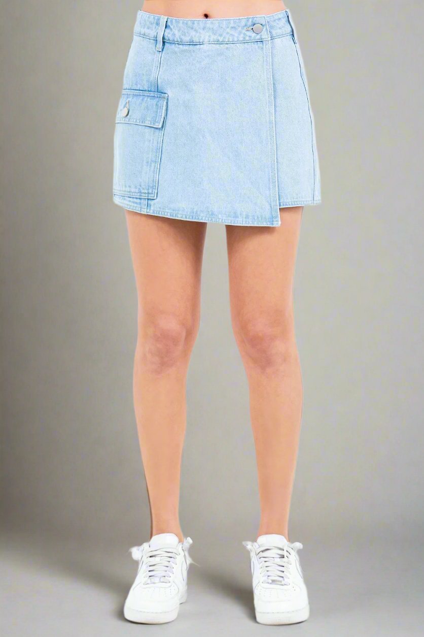 Get ready to rock the cargo trend with our Light Wash Cargo Pocket Mini Skort! Made with a comfy cotton blend, it's perfect for any adventure. You'll love the playful pocket details and the mini skort design adds a touch of flirty fun. Upgrade your wardrobe today!
