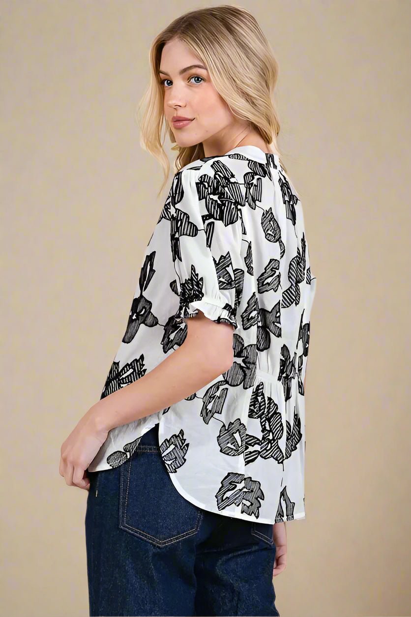 Poppy Print Ruffle Sleeve Blouse in White and Black