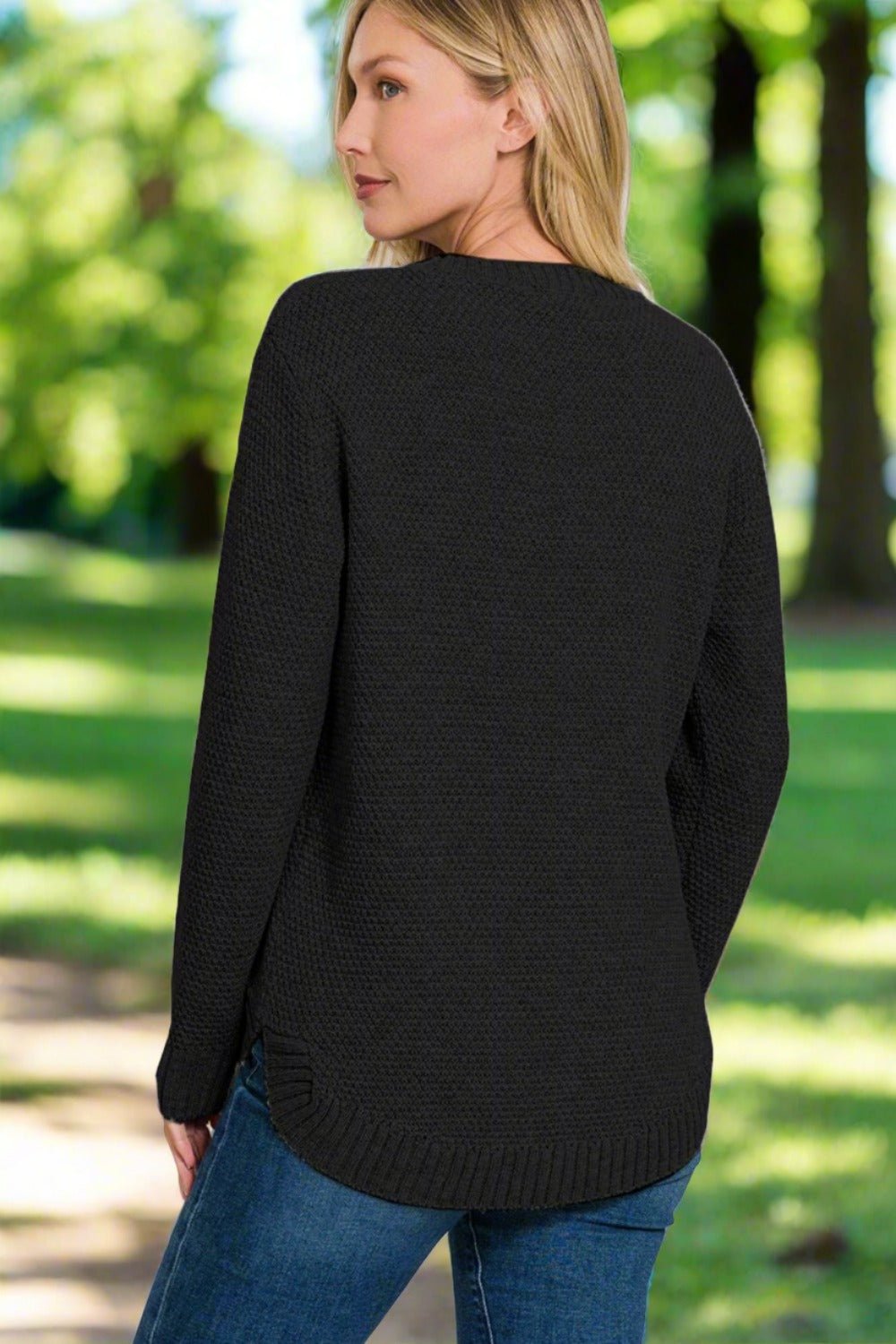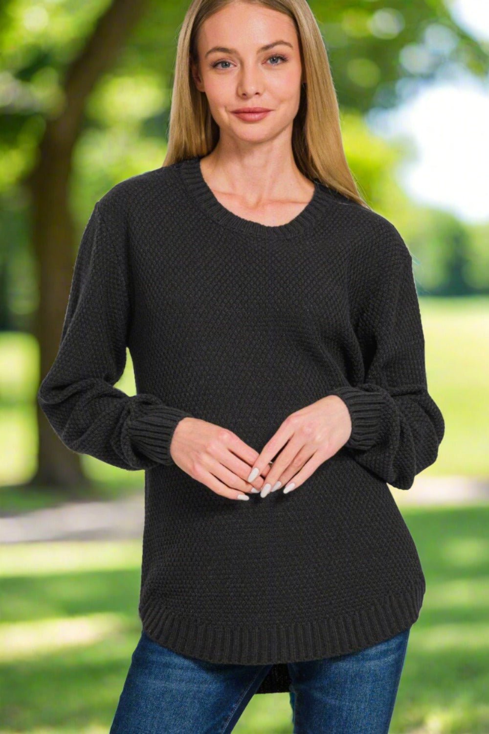 Black Waffle Knit Crewneck Sweater