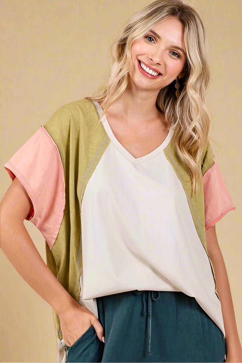 Be playful in this Color Block Short Sleeve T-Shirt in Olive! Made from soft cotton, it features a stylish v-neck and tunic length for a modern look. Perfect for a relaxed day out, this tee will add a touch of fun to any outfit.