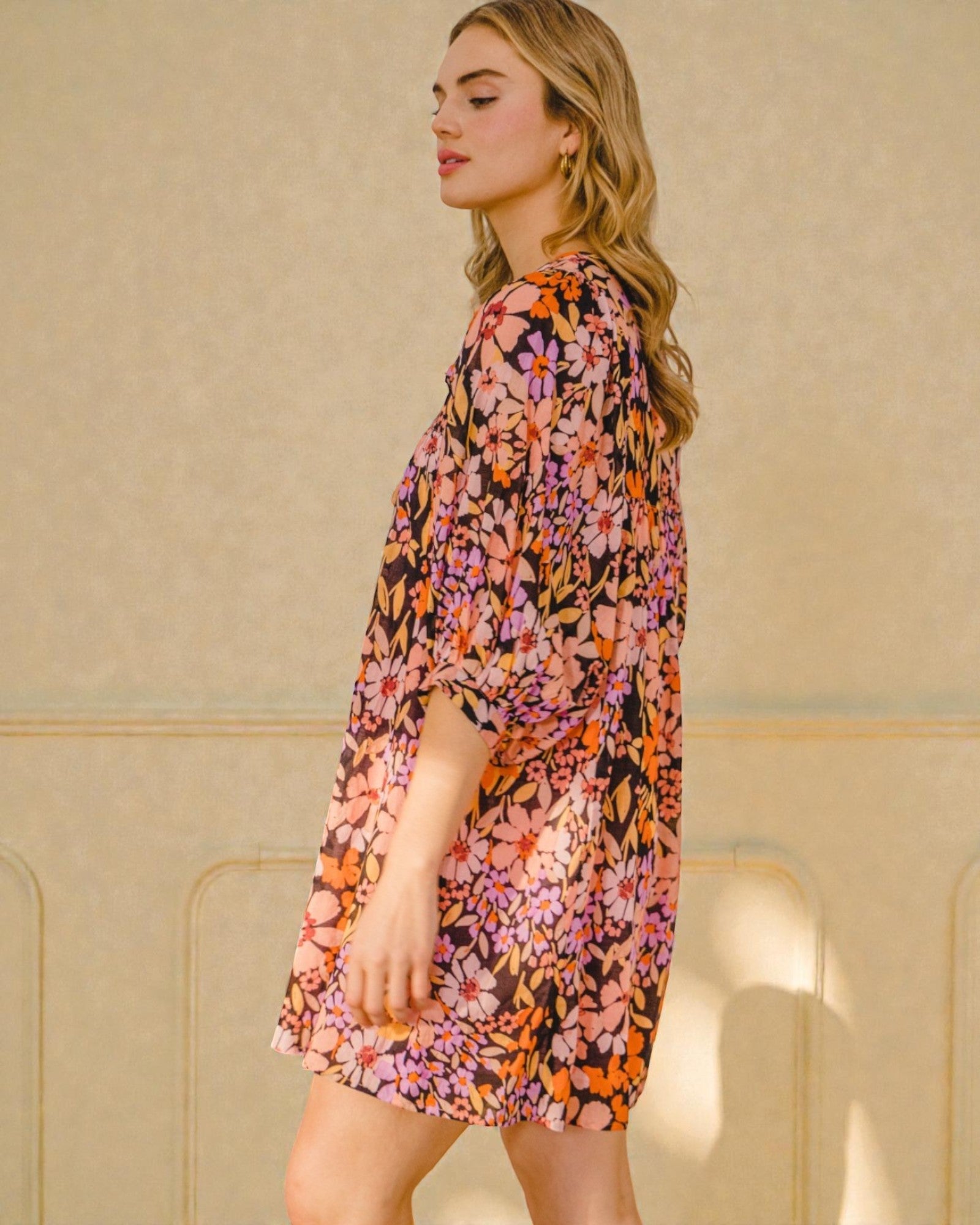 Meet your new go-to dress for those days when you want to feel fabulous without trying too hard. This black floral babydoll mini dress features a soft cotton construction that feels as good as it looks, paired with an adjustable tie neck for a personalized fit. The three-quarter sleeves strike the perfect balance between coverage and breathability, while the playful silhouette flatters every frame.