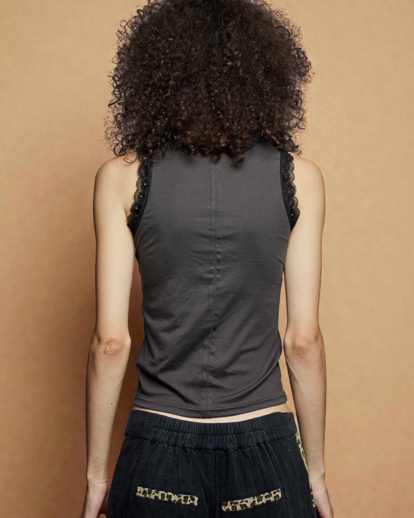 Slip into effortless elegance with this charcoal sleeveless tank, crafted from a breathable Tencel blend that feels as good as it looks. Delicate lace trim adds a touch of feminine charm, while the lightweight fabric keeps you cool and comfortable all day long.