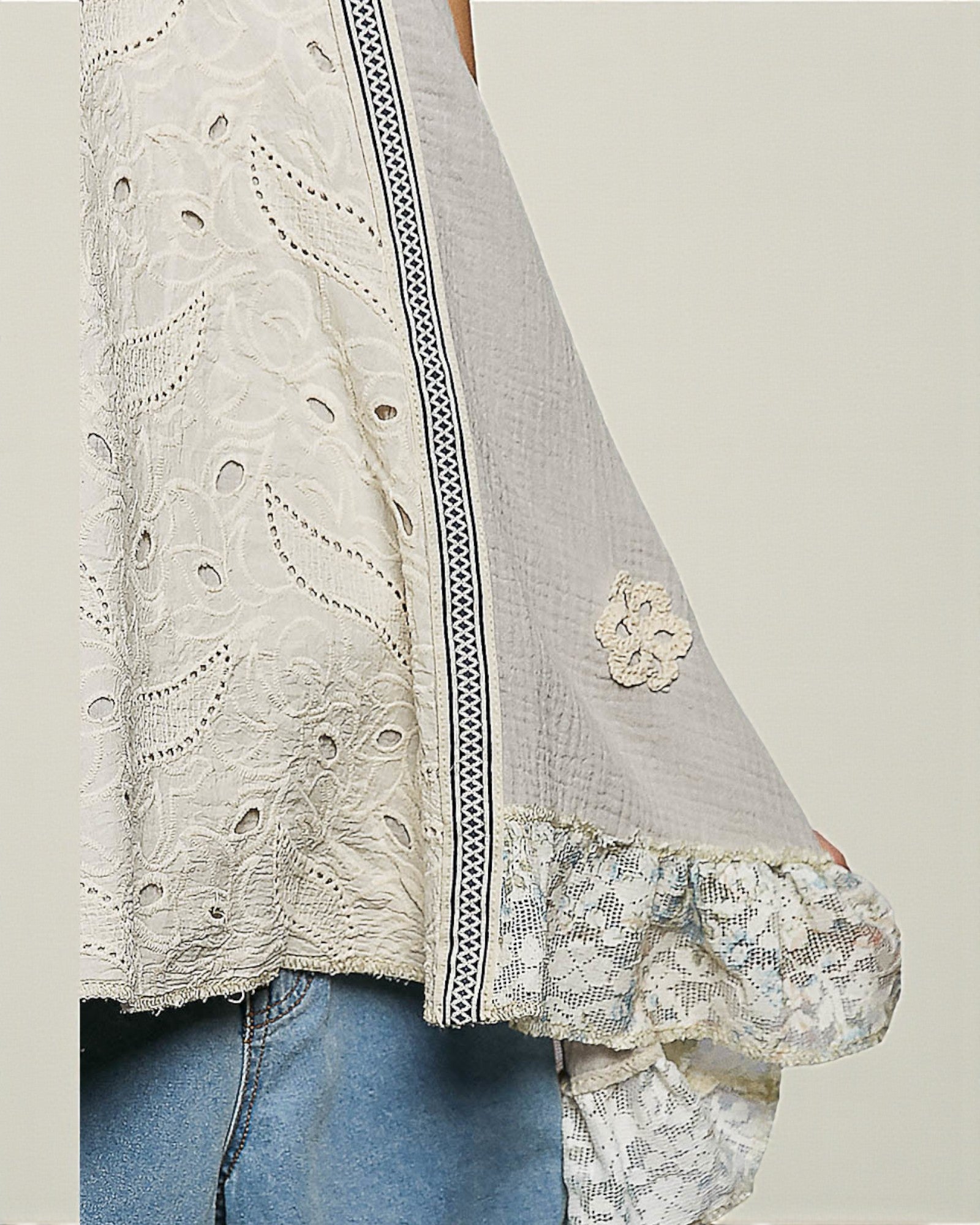 Effortless elegance meets laid-back charm in this halter tunic top. Delicate lace trim adds a touch of romance to the pale stone base, while the relaxed silhouette keeps things breezy and comfortable. Perfect for layering over your favorite swimsuit or pairing with linen pants for a casual-chic vibe.