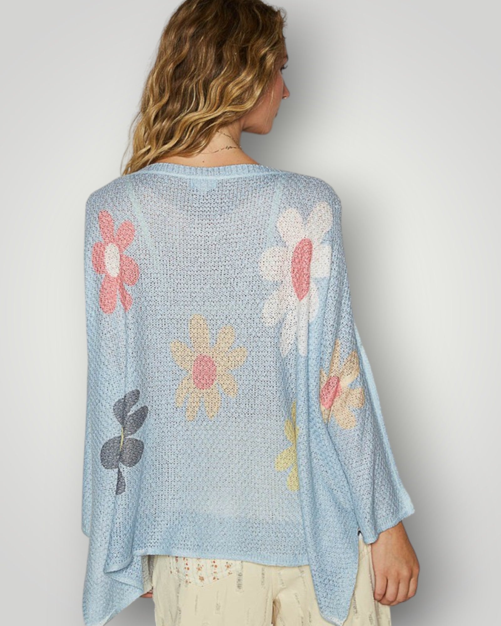 Wrap yourself in effortless comfort with this Sky Blue Floral Knit Sweater. Featuring long sleeves and a relaxed fit that moves with you, it's the perfect piece for layering or wearing solo. The soft knit fabric drapes beautifully while the delicate floral pattern adds a touch of charm to your everyday wardrobe.