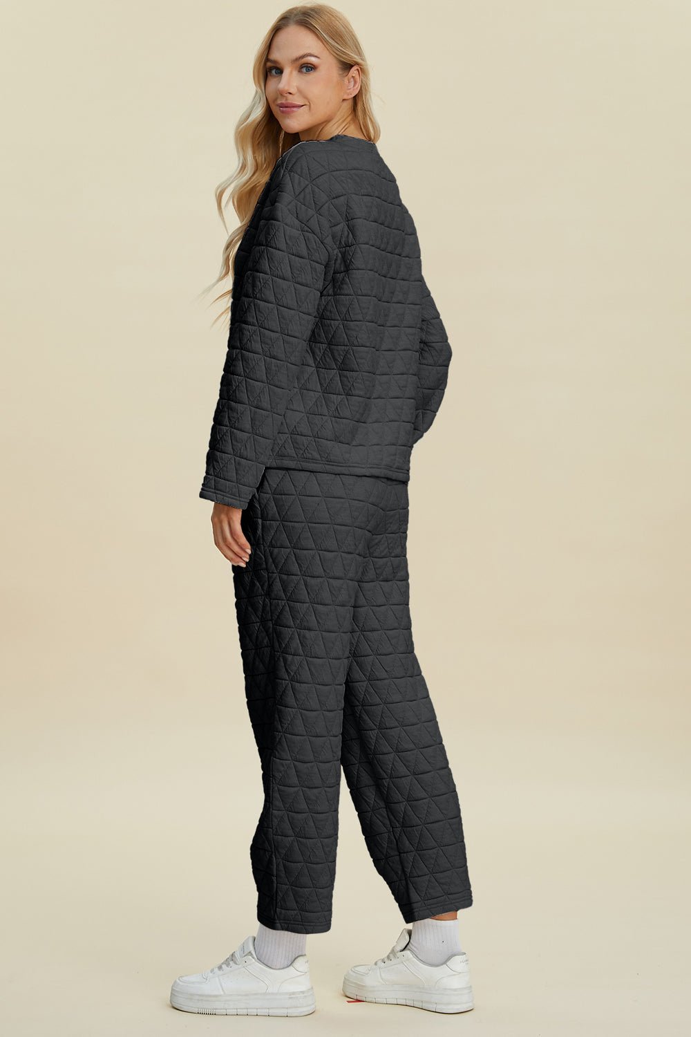 Get cozy in this quilted set featuring long sleeves, light stretch, and convenient pockets. Choose from a variety of colors and plus sizes. Perfect for lounging or running errands. Comfy and stylish? Yes, please!