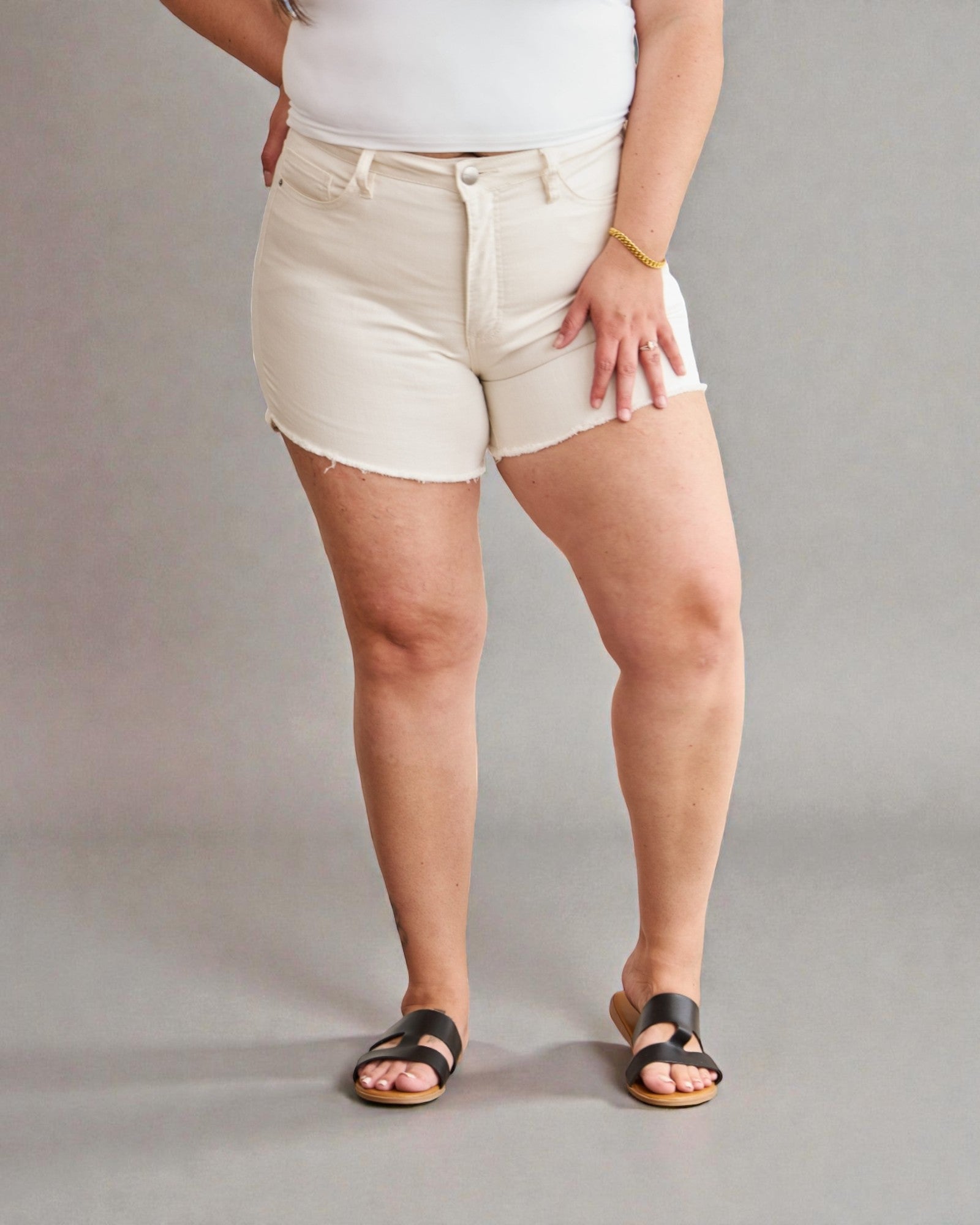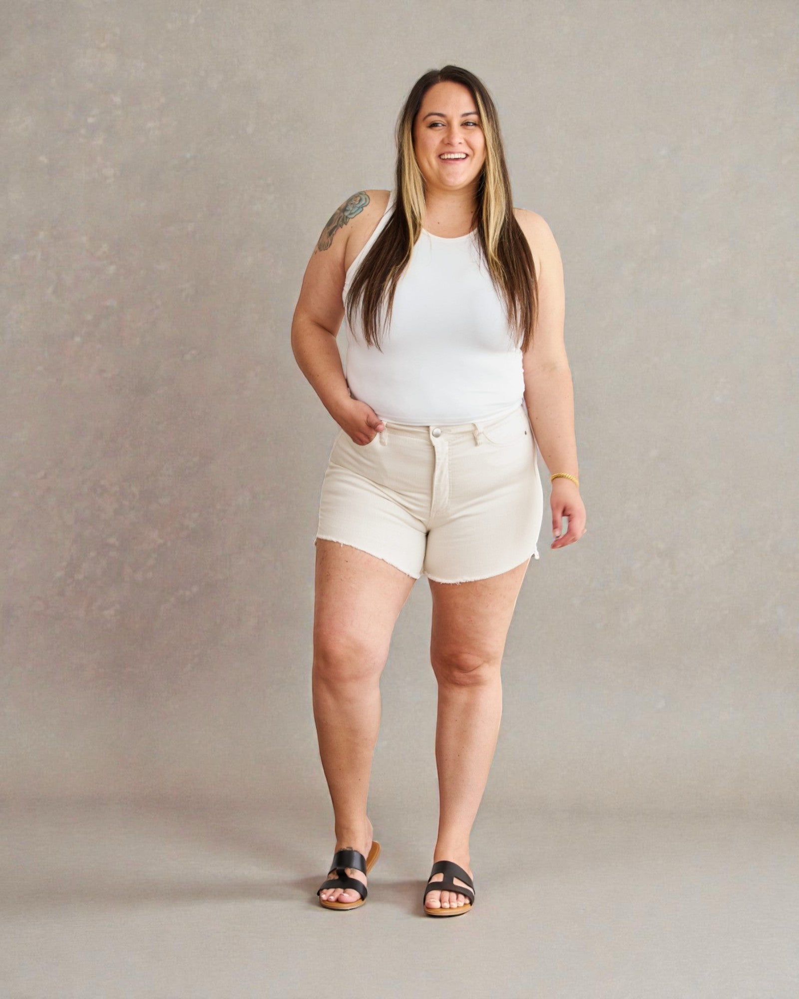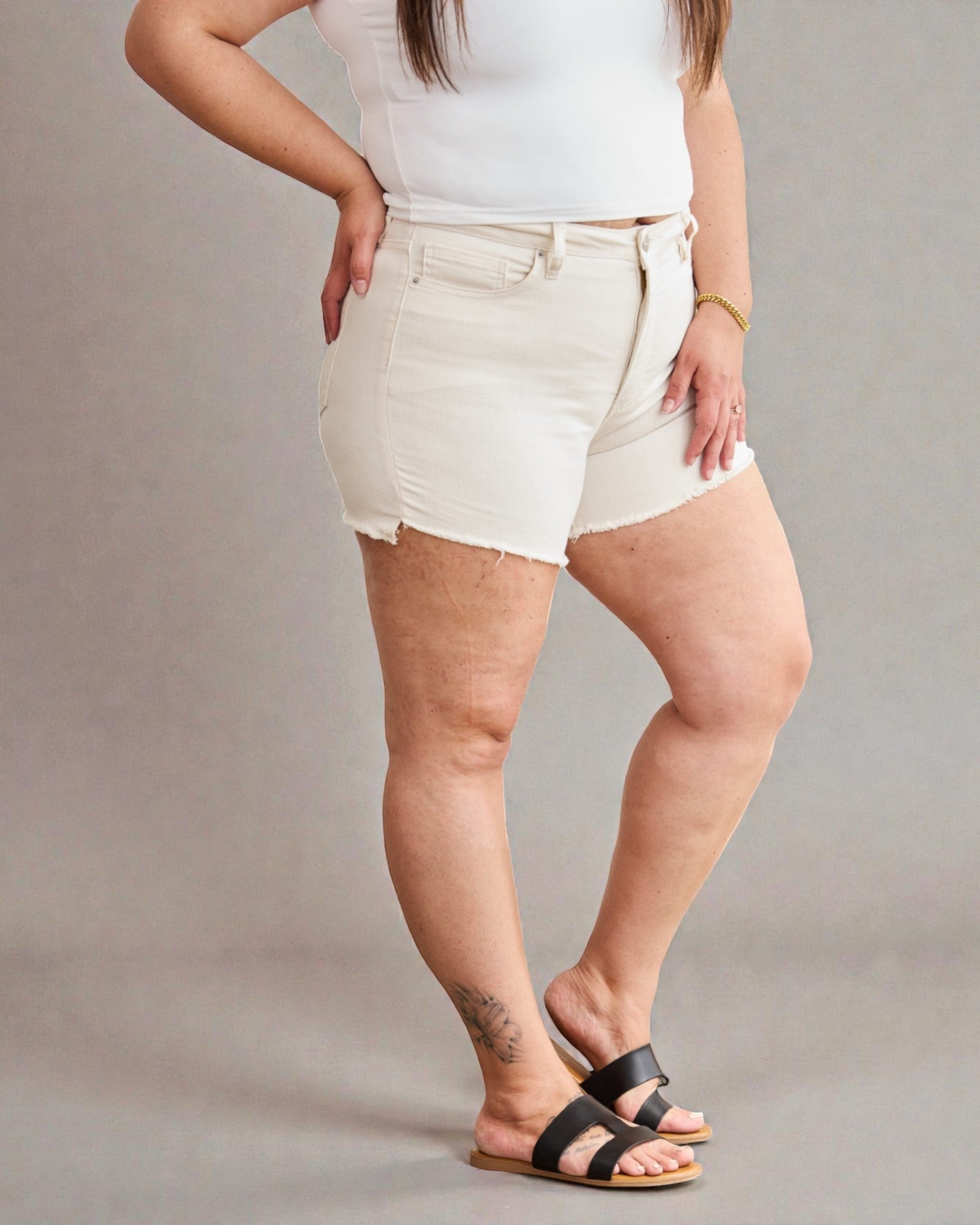 These ivory high-rise denim shorts are your new summer essential! Crafted from a comfortable cotton blend with just the right amount of stretch, they move with you all day long. The flattering high-rise cut pairs perfectly with built-in tummy control for a smooth, confident silhouette. Available in plus sizes, everyone can rock this timeless neutral shade.