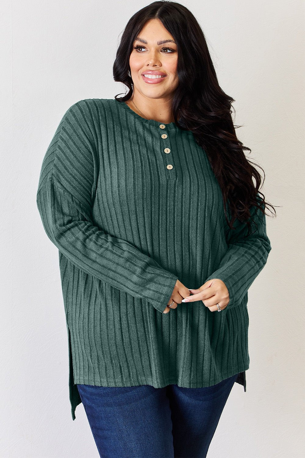 Introducing our Rib Knit Half Button Long Sleeve High-Low Hem T-Shirt, your new go-to for effortless style. With multiple color options, tunic length, and plus sizes available, this top offers both versatility and comfort. Perfect for any occasion, from casual to dressed up.