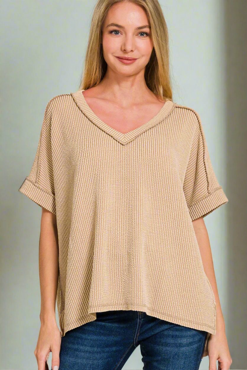 Get cozy and cute with our Rib Knit T-Shirt! The v-neck and exposed seams add a touch of style, while the oversized fit ensures all-day comfort. Perfect for a laid-back look with a high-low hem in Light Mocha. P.S. Oversized = extra room for snacks! 🍿