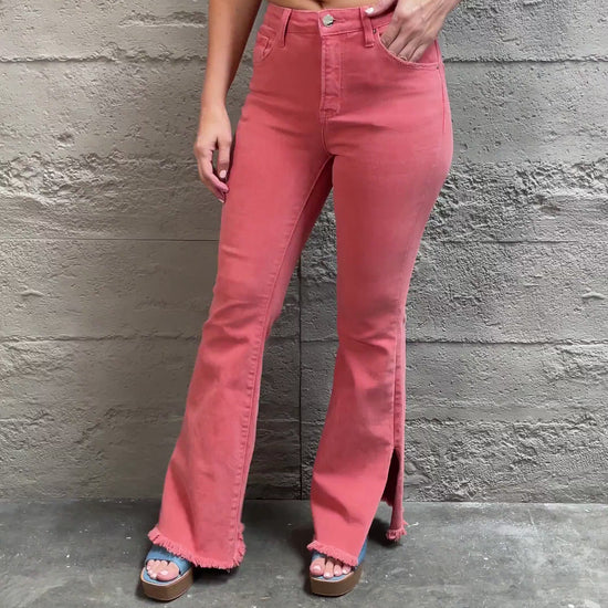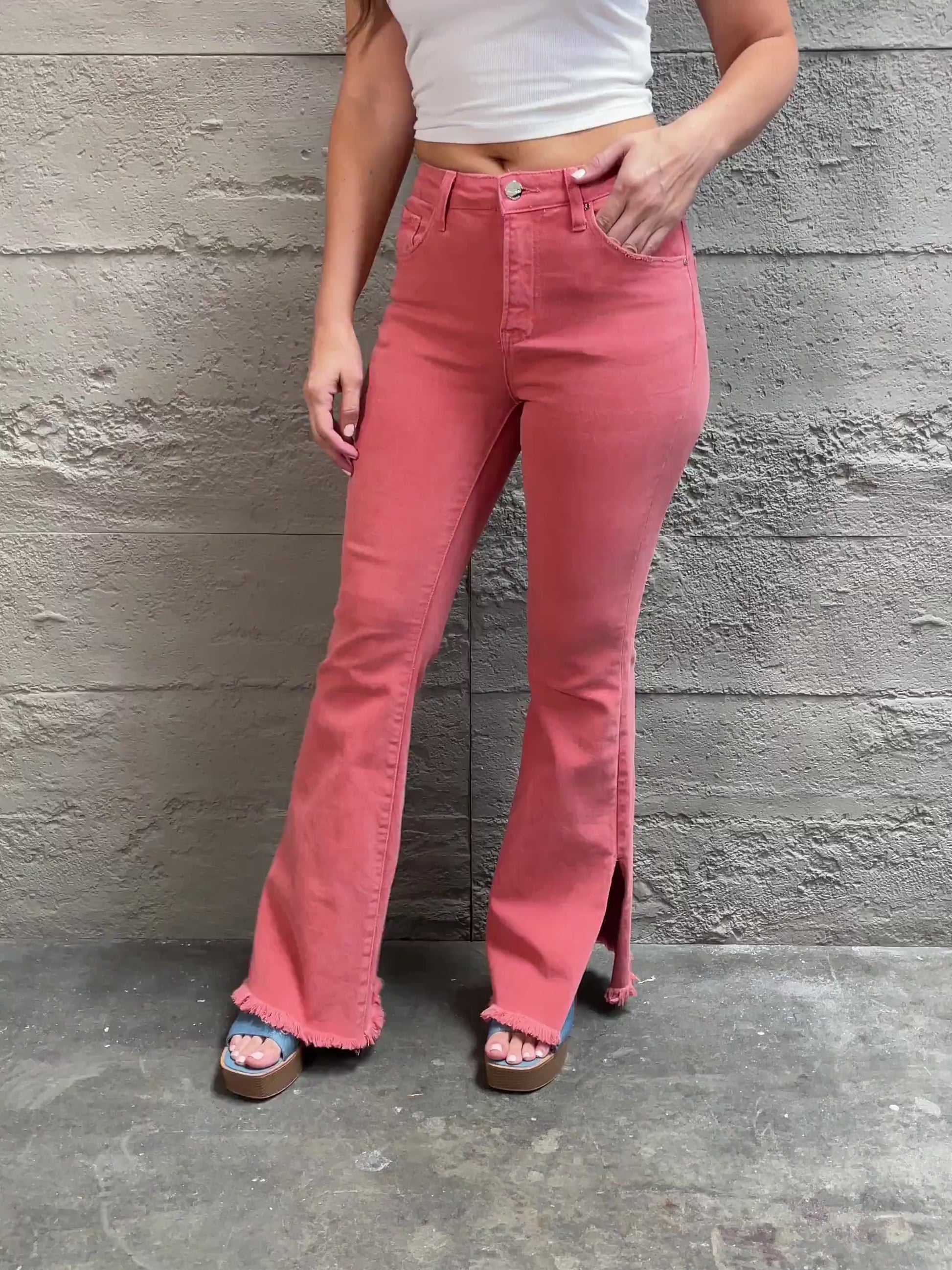 Flare out in style with these Coral Clay Raw Hem Flare Jeans—a playful twist on a timeless silhouette. Crafted from a soft cotton blend with just enough stretch to move with you, these jeans feature a chic side slit hem that adds an unexpected edge. The relaxed flare cut flatters every frame, and we've got you covered with plus sizes available.