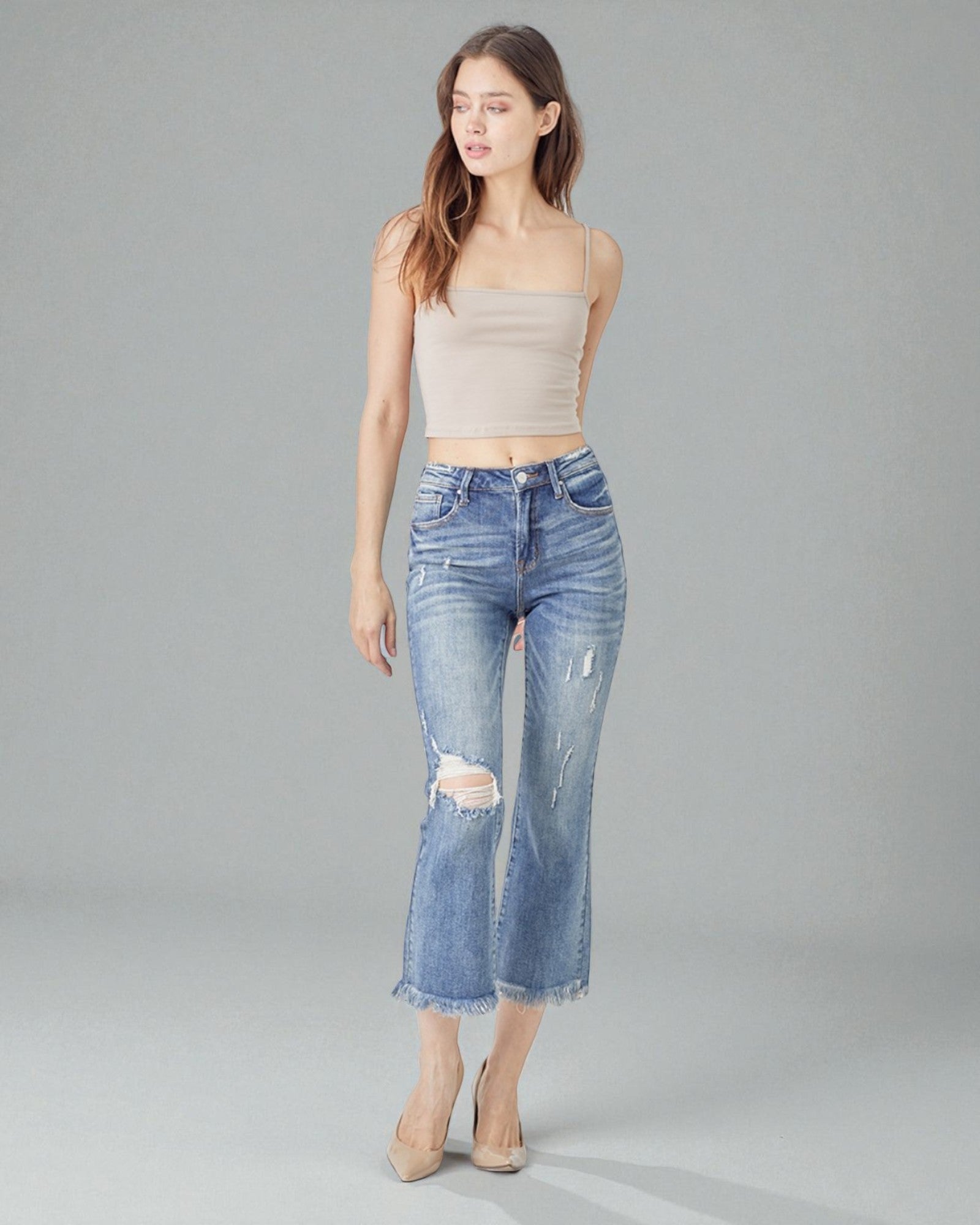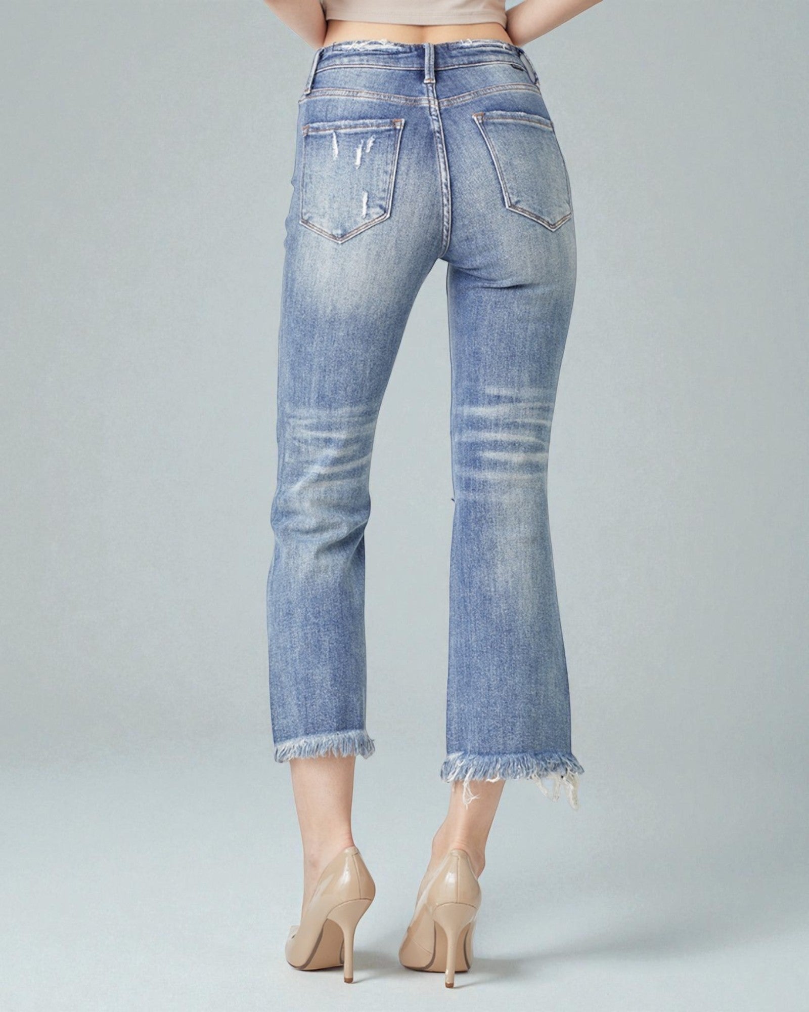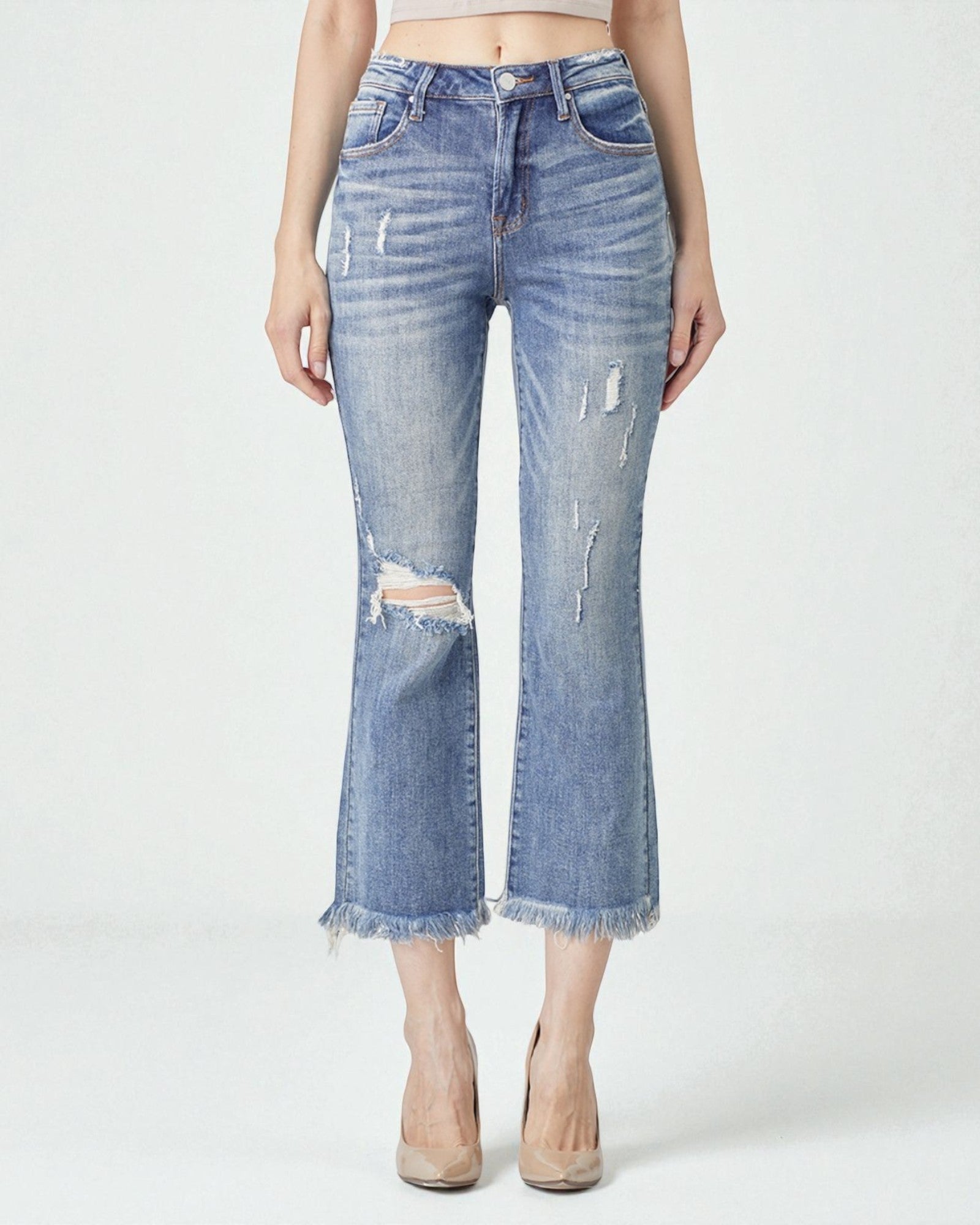 Medium Wash Distressed Cropped Flare Jeans