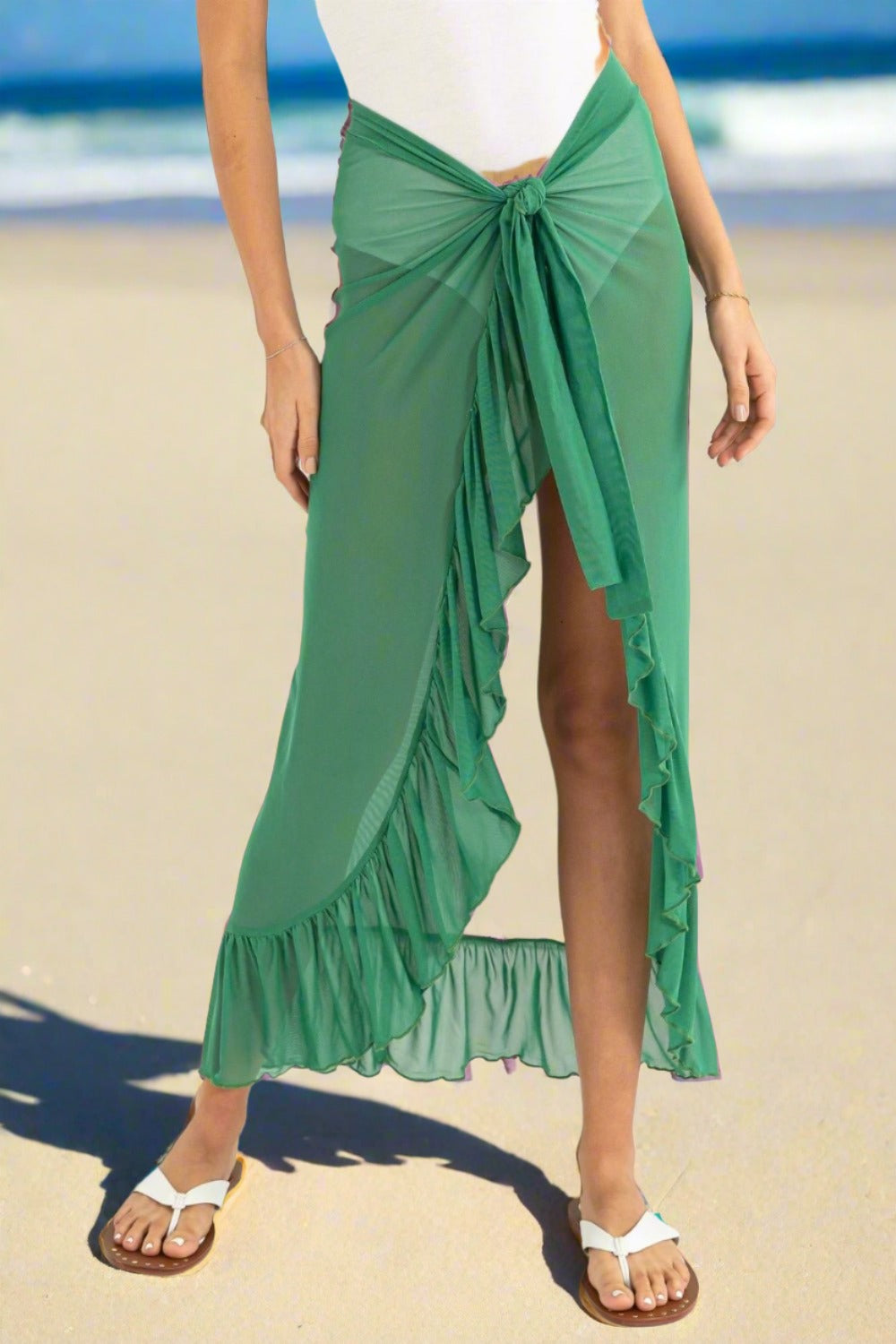 Dive into effortless beach style with our Emerald Ruffle Tie-Front Swim Sarong—the perfect cover-up that's as fun as it is flattering. Crafted in a stunning emerald hue, this maxi-length sarong features delicate ruffles and an adjustable tie-front closure that lets you customize your fit and flaunt your personal style.