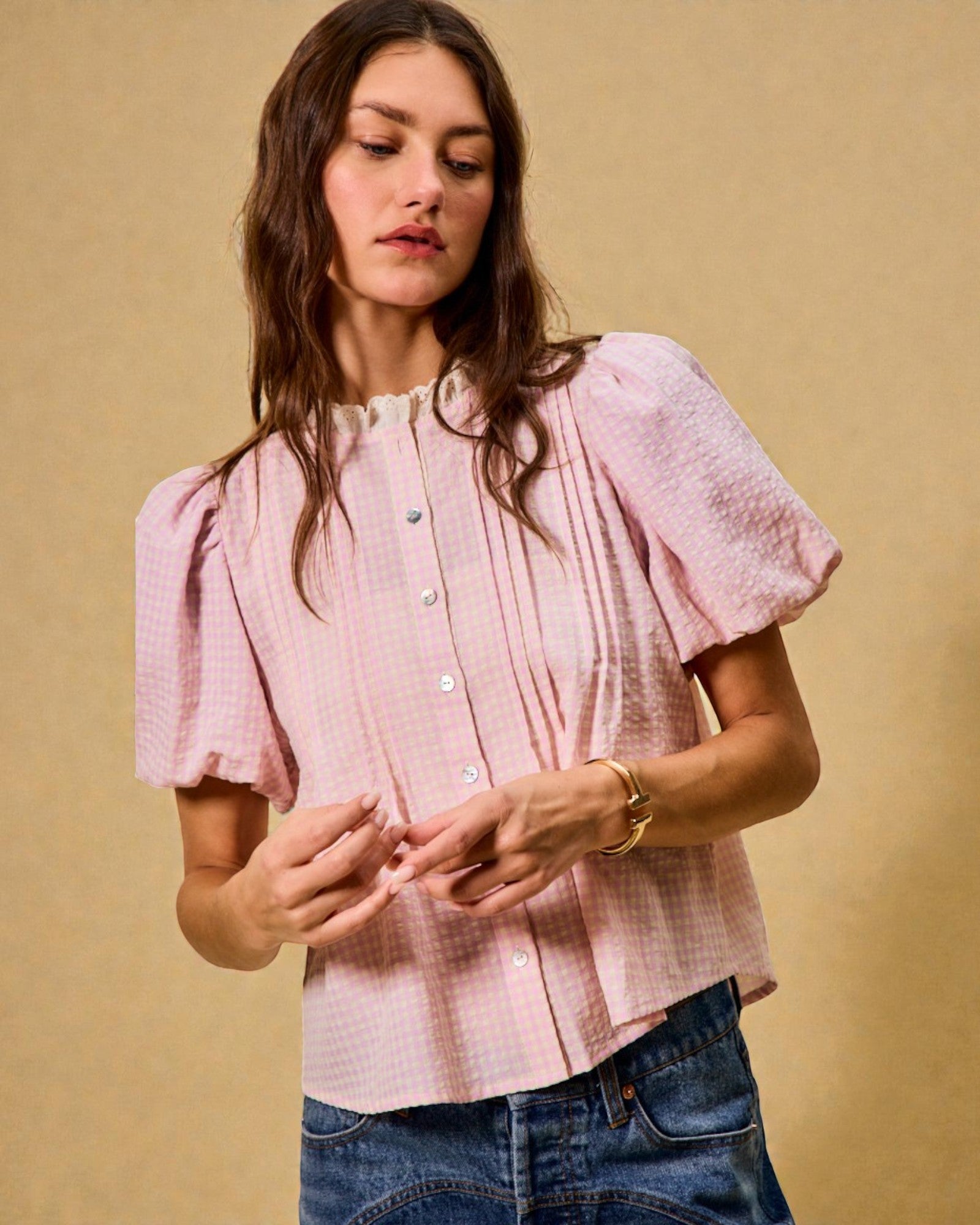 Blush Gingham Puff Sleeve Button-Up Top