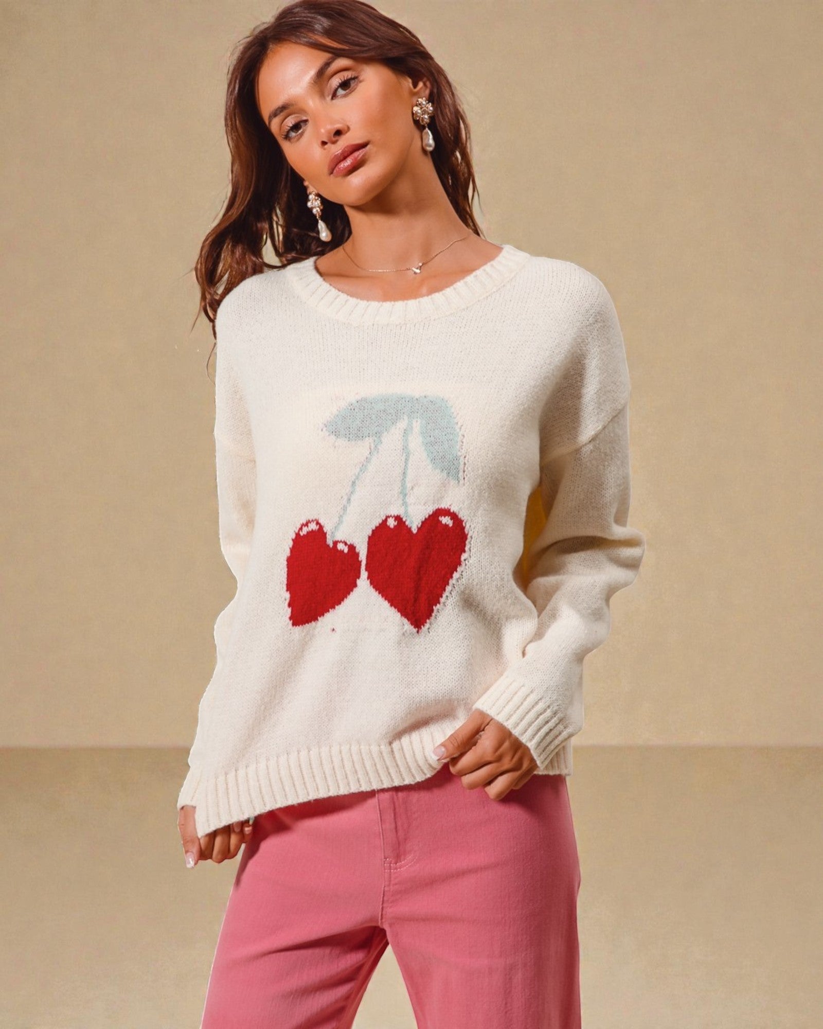 Wrap yourself in cozy charm with this cream knit sweater, featuring an adorable heart cherry graphic that brings a touch of whimsy to your everyday wardrobe. The long sleeves provide warmth and comfort, making it perfect for layering or wearing solo during cooler months.