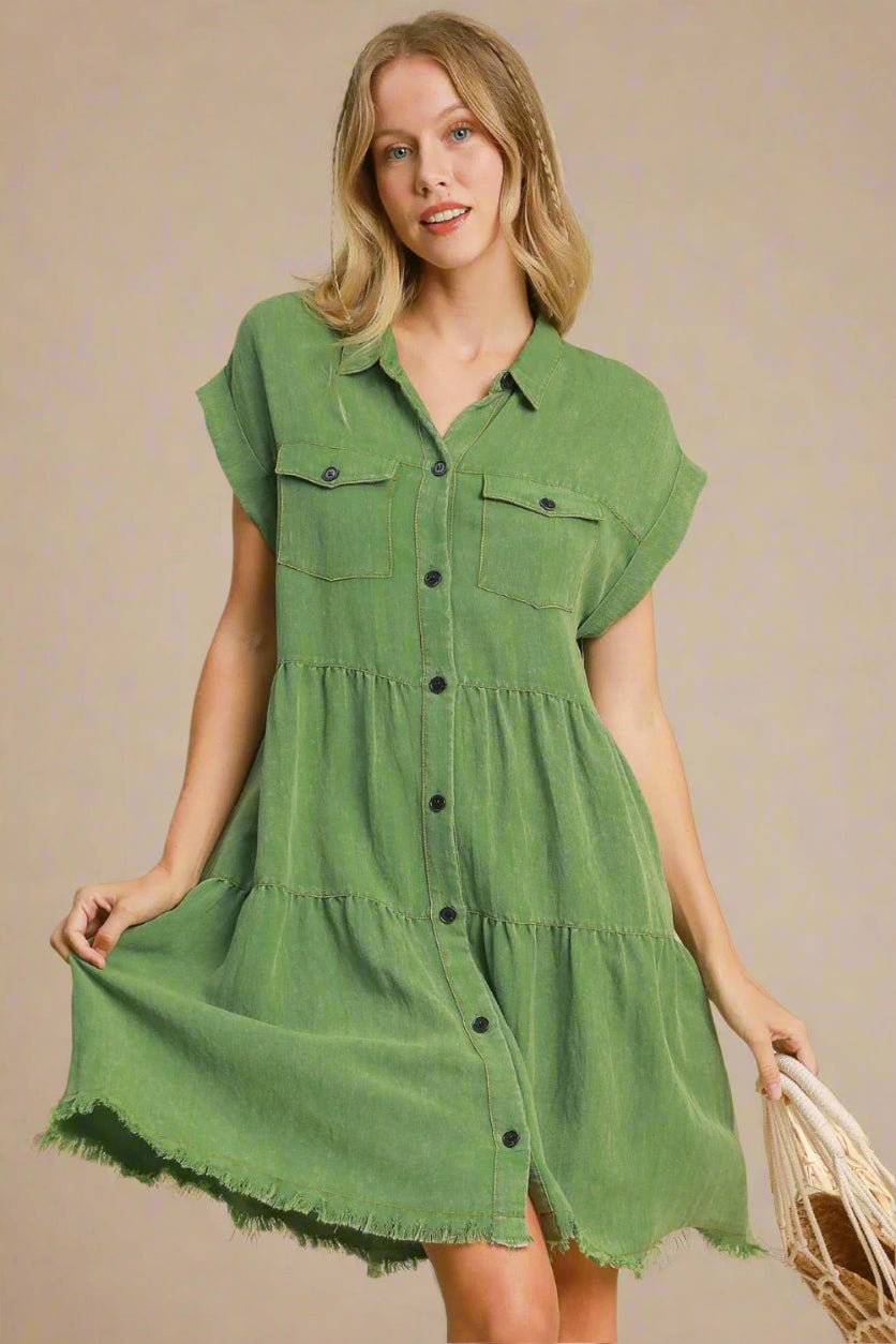 This mini shirt dress features a frayed hemline for a touch of edginess. Made from a comfortable rayon blend, this dress also boasts a button front for added convenience. Plus sizes available. Be stylish and carefree in this Green Frayed Hemline Mini Shirt Dress.