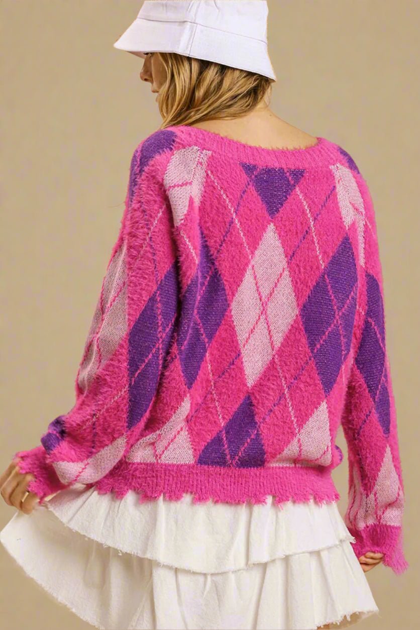 Hot Pink Button Front Argyle Cardigan Sweater