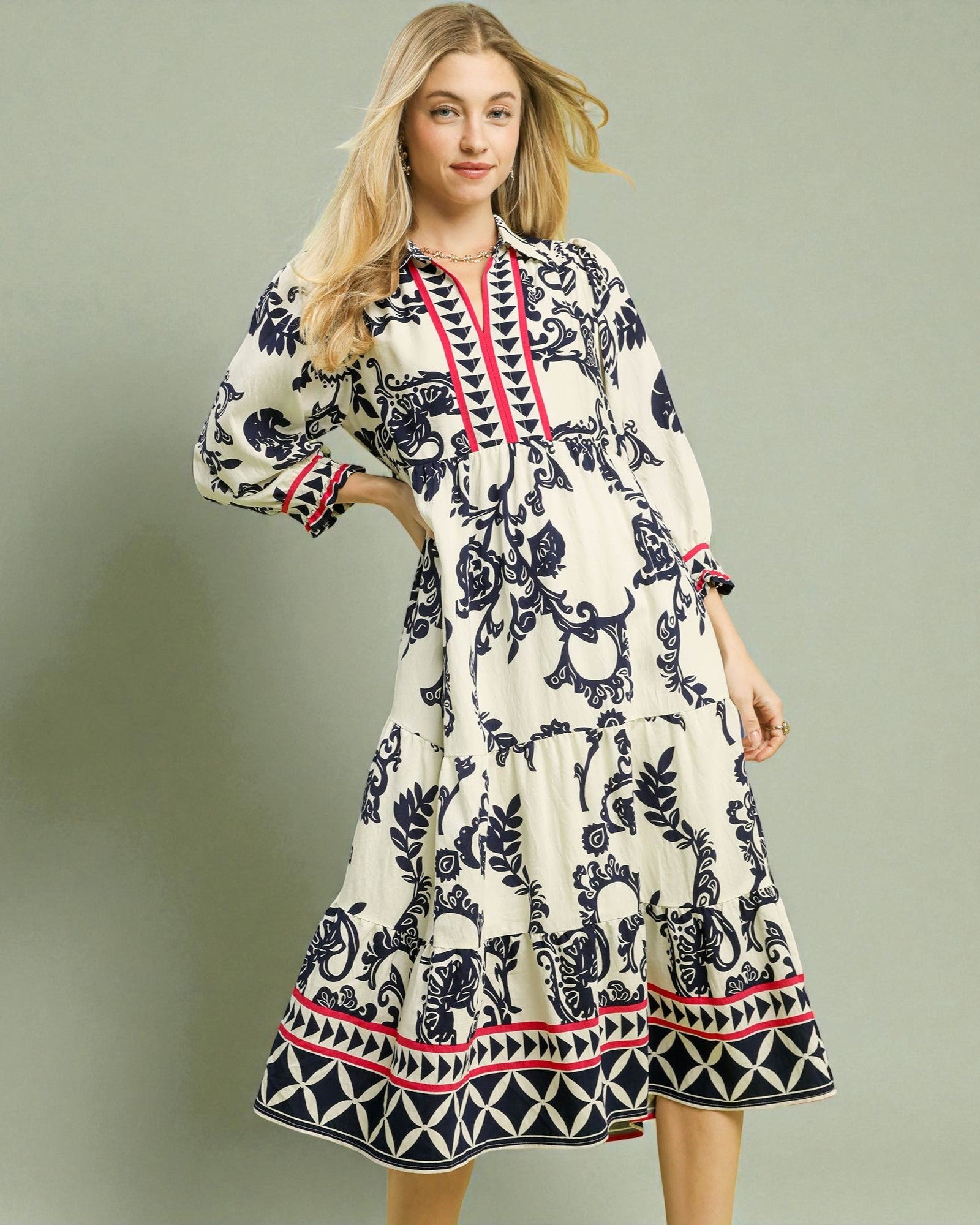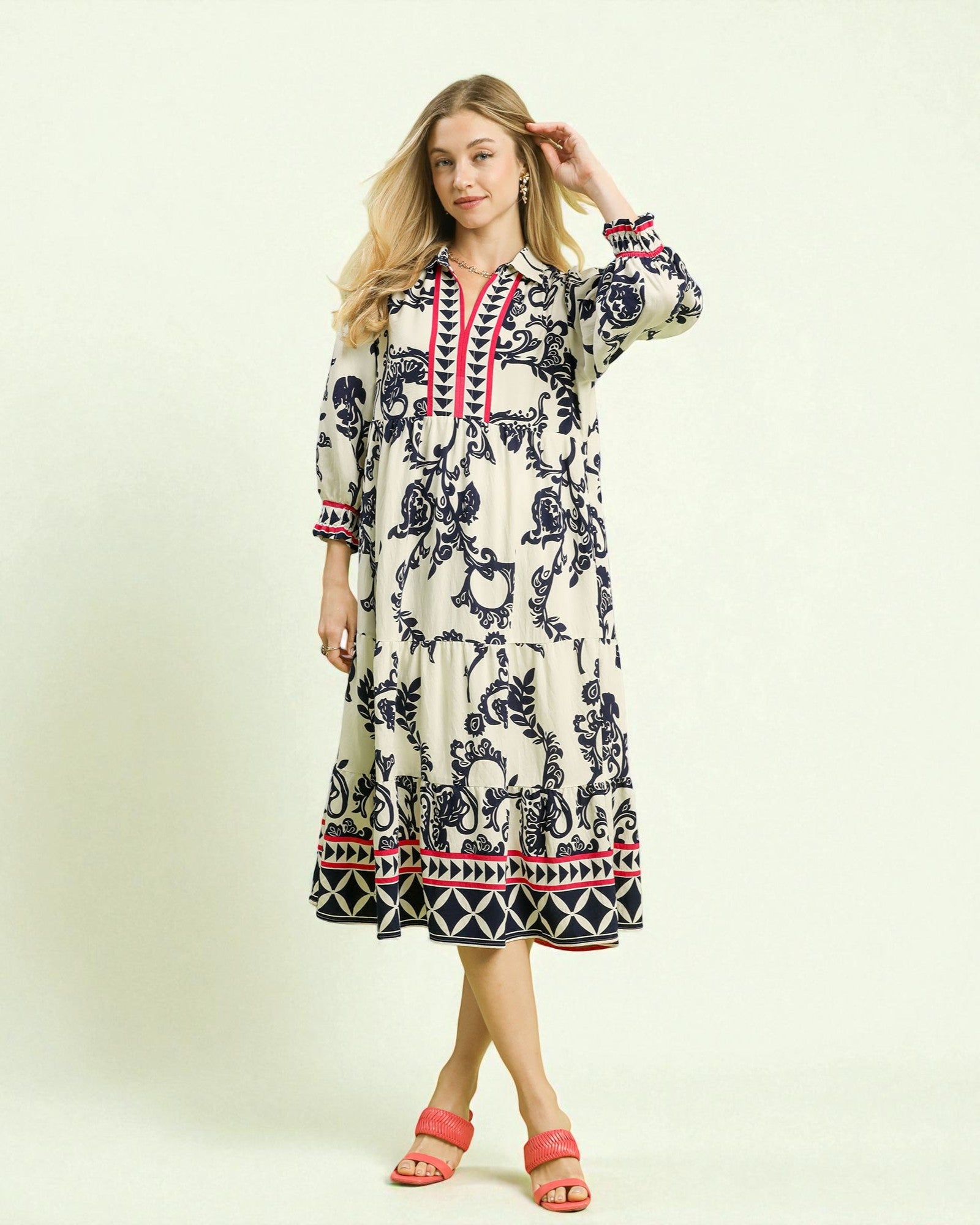 Effortlessly chic and ready for anything, this ivory and navy printed midi dress is your new go-to piece. Crafted from a luxurious rayon blend that feels as good as it looks, it features a lined silhouette for confidence and flattering three-quarter sleeves that hit just right.