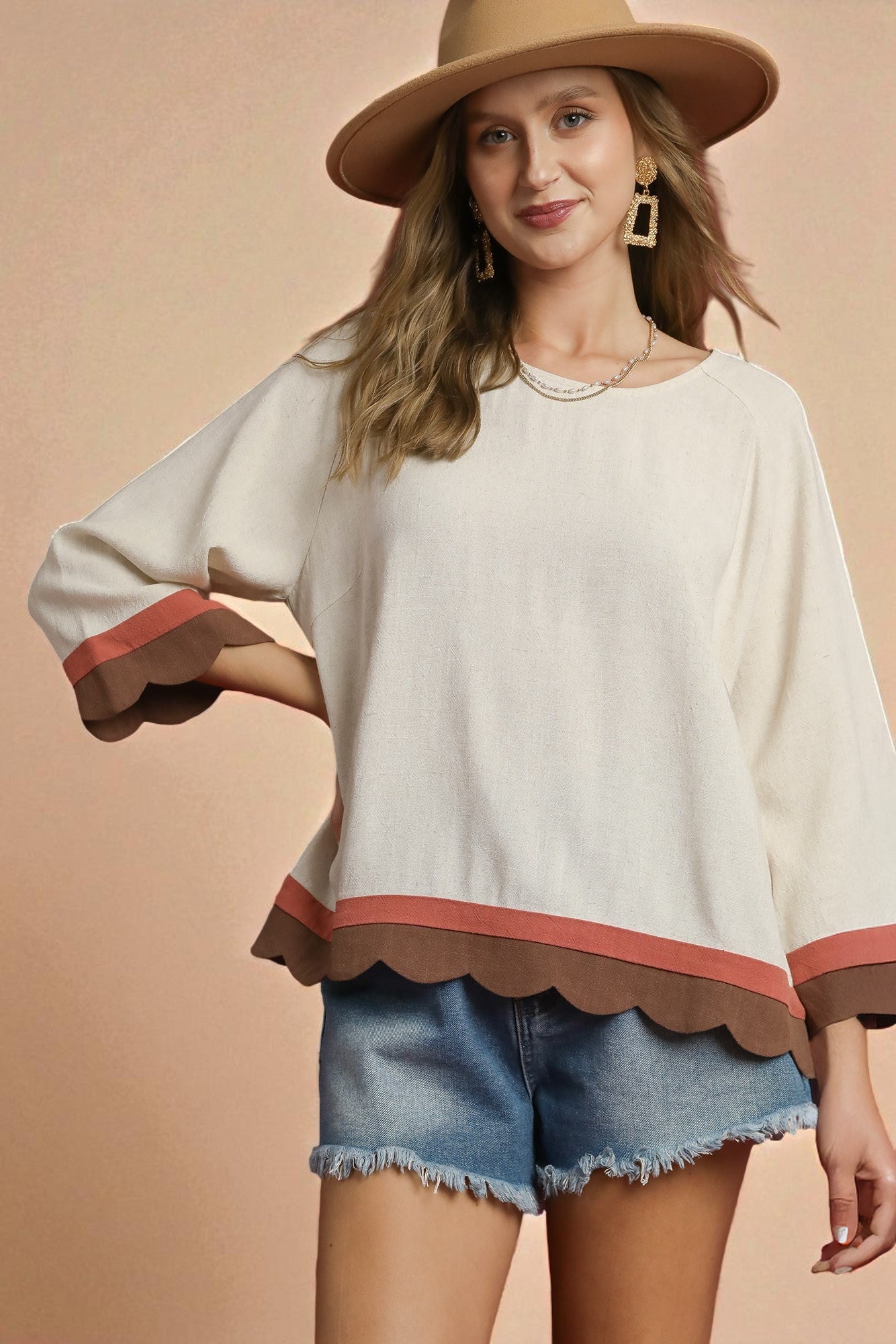Mixing the breezy comfort of linen with the soft touch of cotton, this Ivory Scallop Trim Blouse is your new go-to for effortless style. Its playful scallop edging adds a charming detail, while the three-quarter sleeves keep things breezy yet polished. Perfect for days when you want to feel light, cool, and cute all at once.