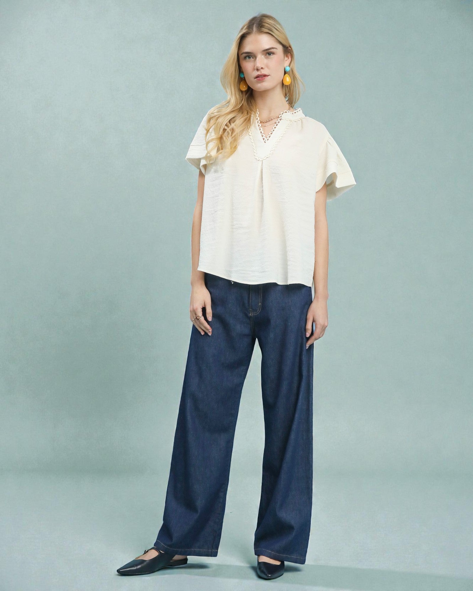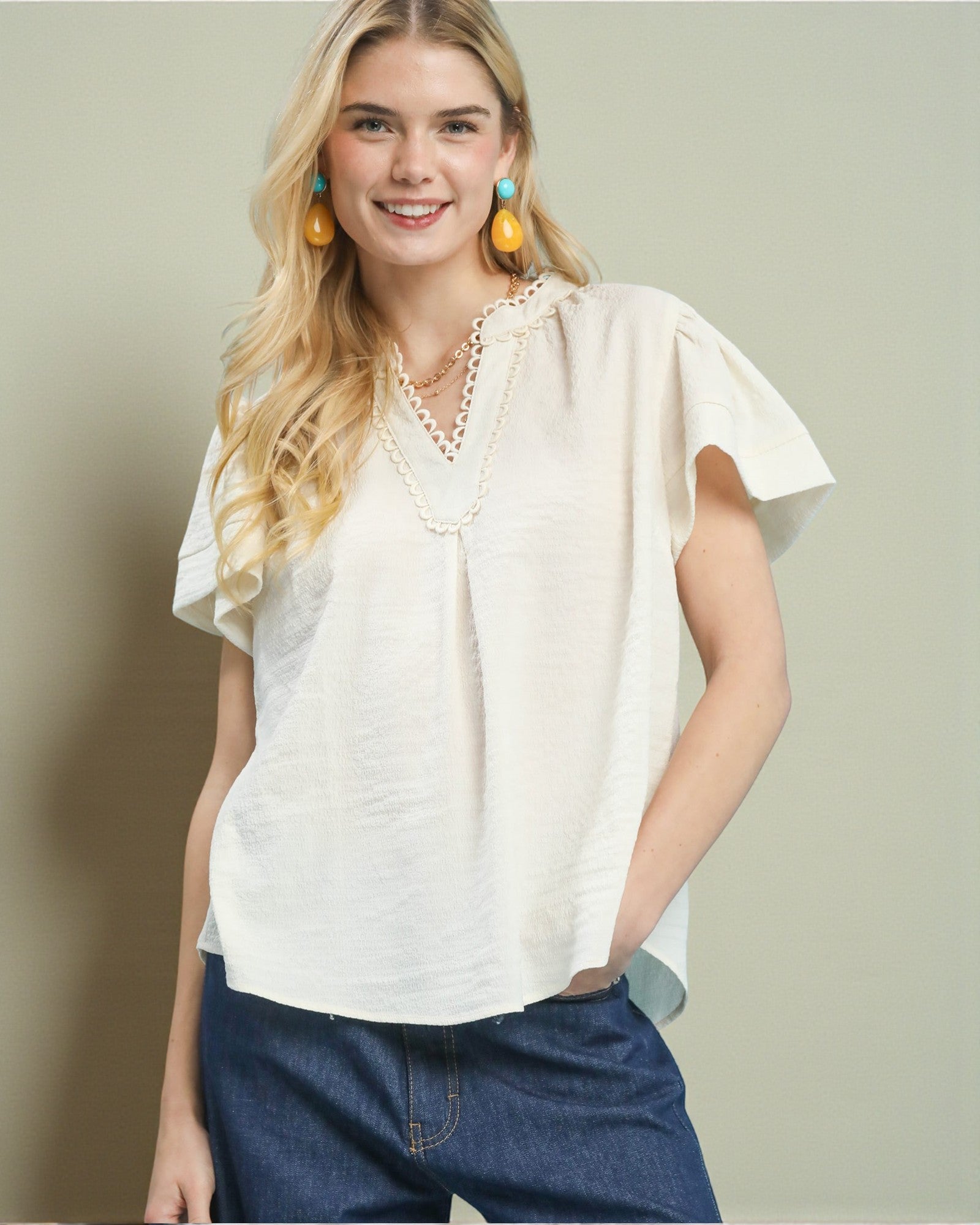 Effortless elegance meets whimsical charm in this ivory blouse. Crafted from a breathable rayon blend, it drapes beautifully while keeping you cool and comfortable. The delicate scallop trim adds a touch of feminine detail, while short flutter sleeves create a playful, romantic silhouette perfect for everything from brunch dates to casual office days.