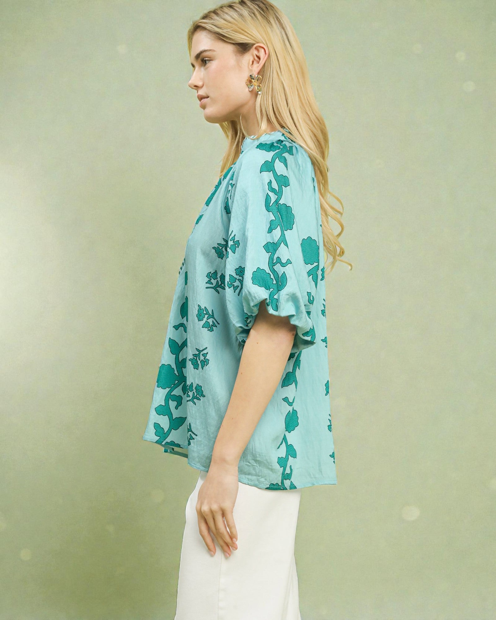 Soft rayon blend fabric meets effortless charm in this mint floral blouse. Short puff sleeves add a touch of whimsy and movement, while the delicate print brings garden-fresh appeal to your everyday rotation.