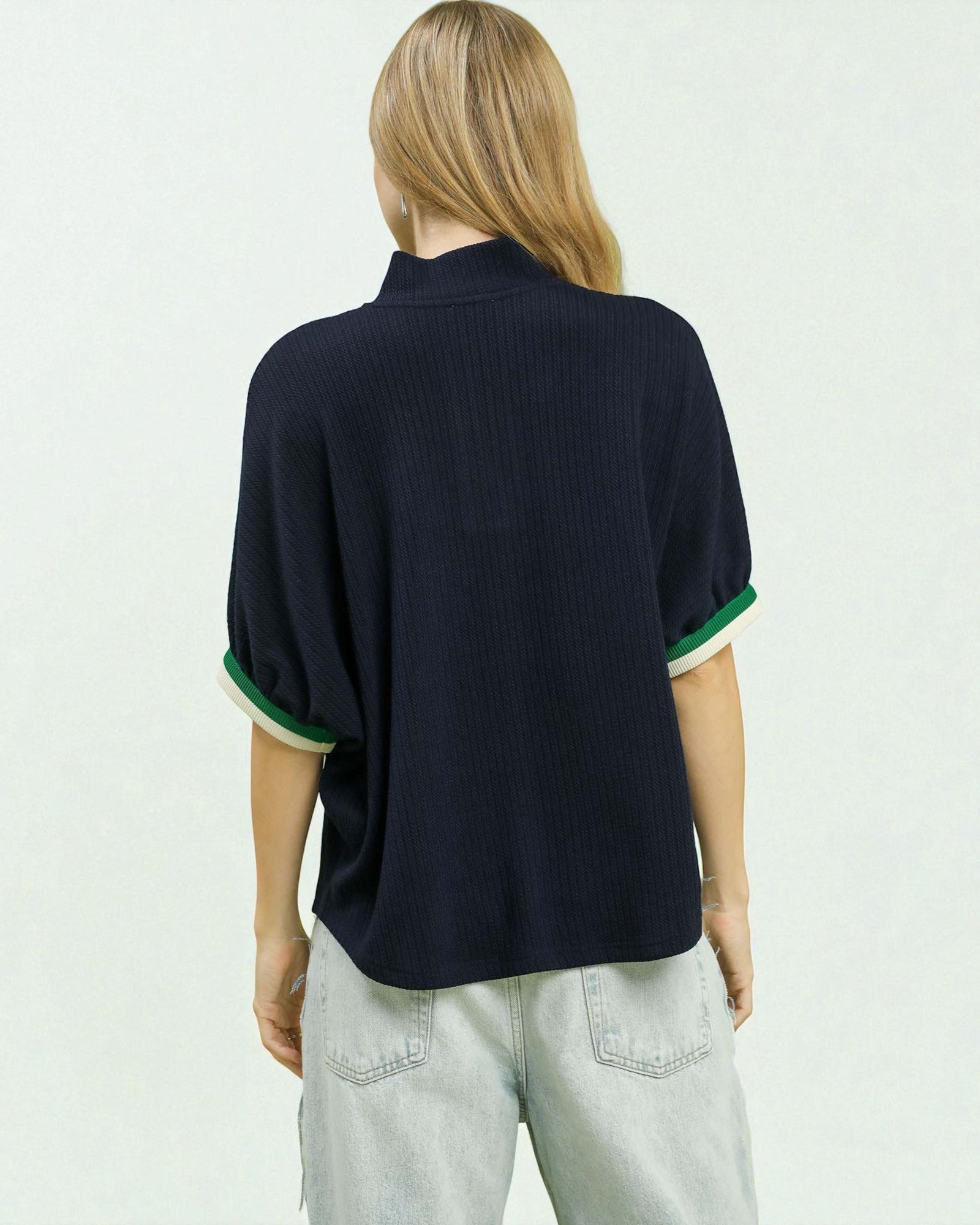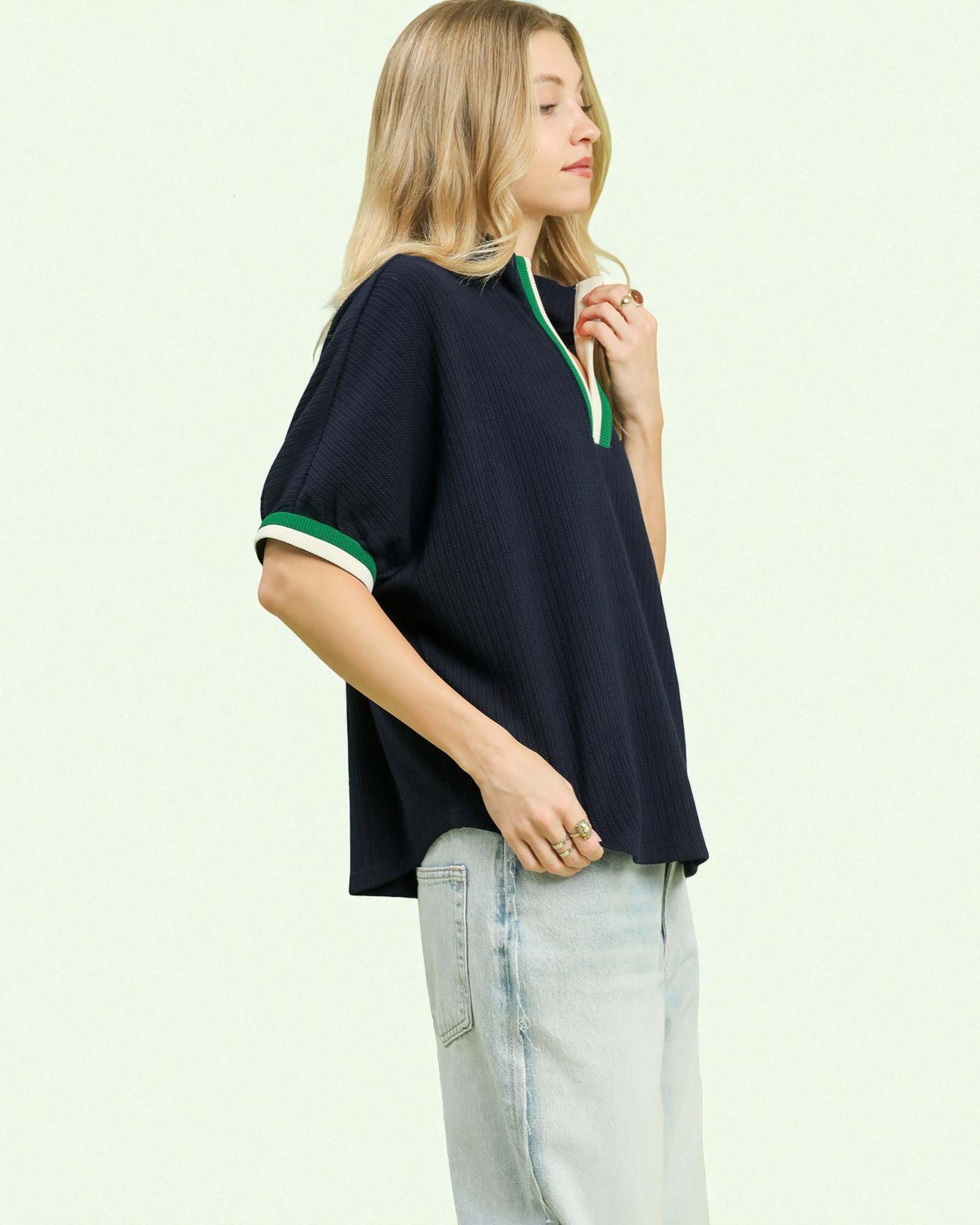 Navy & Green Contrast Trim Knit Top Effortlessly chic meets comfort in this breezy knit top! Featuring short sleeves and a relaxed fit that moves with you, it's your new go-to for laid-back days. The playful navy and green contrast trim adds just the right pop of personality to elevate any casual look. Throw it on with your favorite jeans or shorts and you're ready to go.