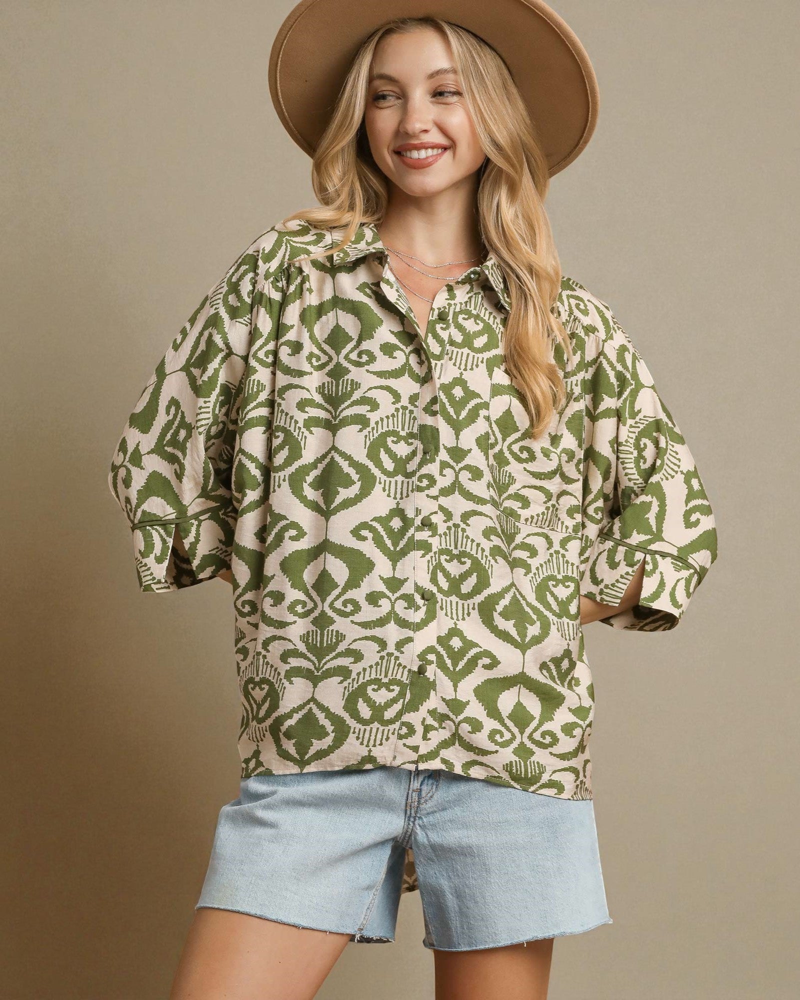 Effortlessly chic meets wonderfully comfy in this Olive & Cream Ikat Button-Up Shirt. The soft rayon blend drapes beautifully while the relaxed fit lets you move freely—perfect for lazy beach days or casual outings. Featuring a striking ikat pattern that adds visual interest without trying too hard, this shirt pairs seamlessly with everything from linen shorts to your favorite jeans. Throw it on and feel instantly put-together.