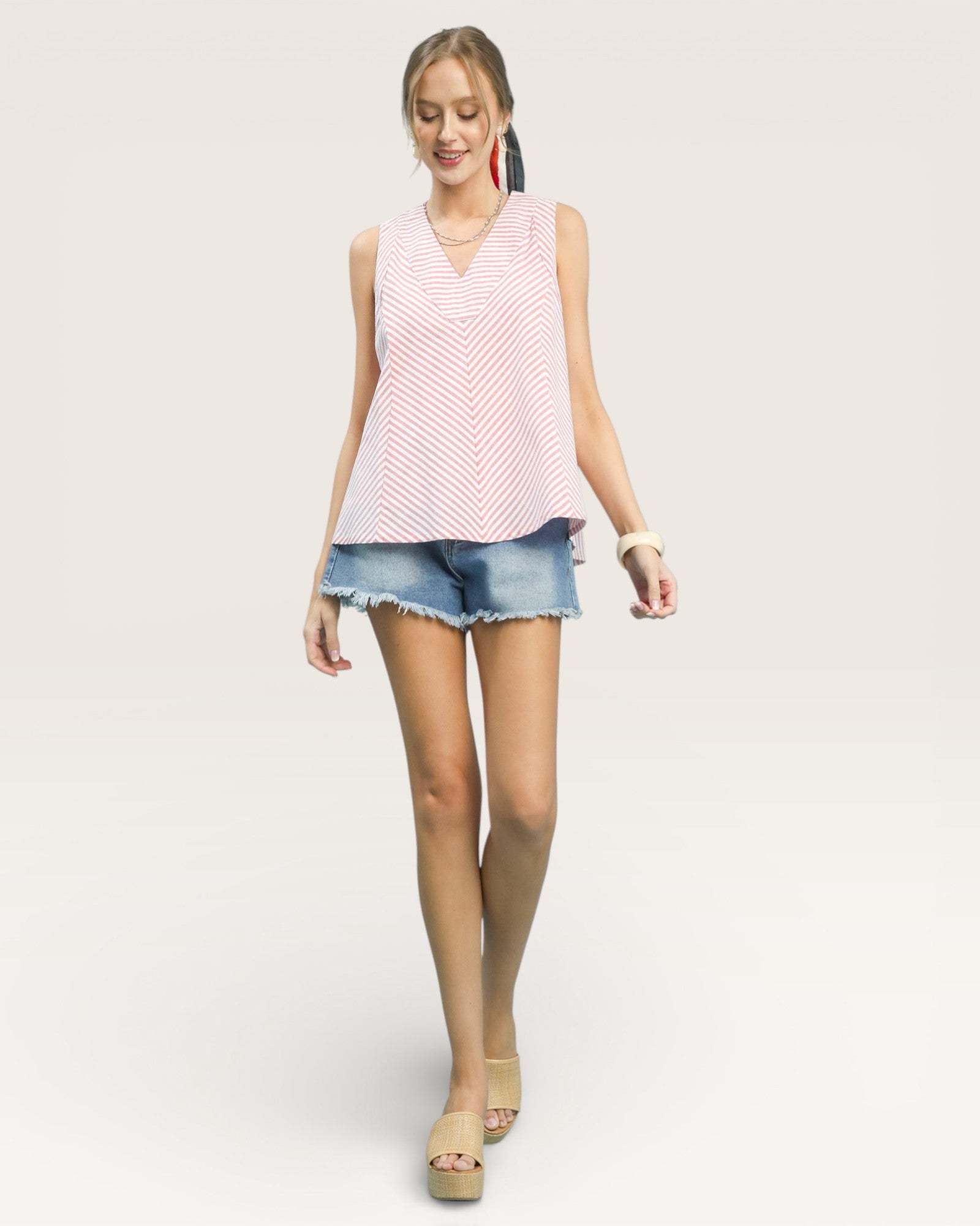 Pink & White Striped V-Neck Tank Top Effortless summer style meets comfort in this breezy cotton blend tank. The classic pink and white stripes bring a timeless, preppy vibe that pairs with everything from denim cutoffs to linen pants. The flattering V-neckline keeps things cool and casual, while the breathable fabric makes it perfect for warm days, beach trips, or layering under your favorite jacket.
