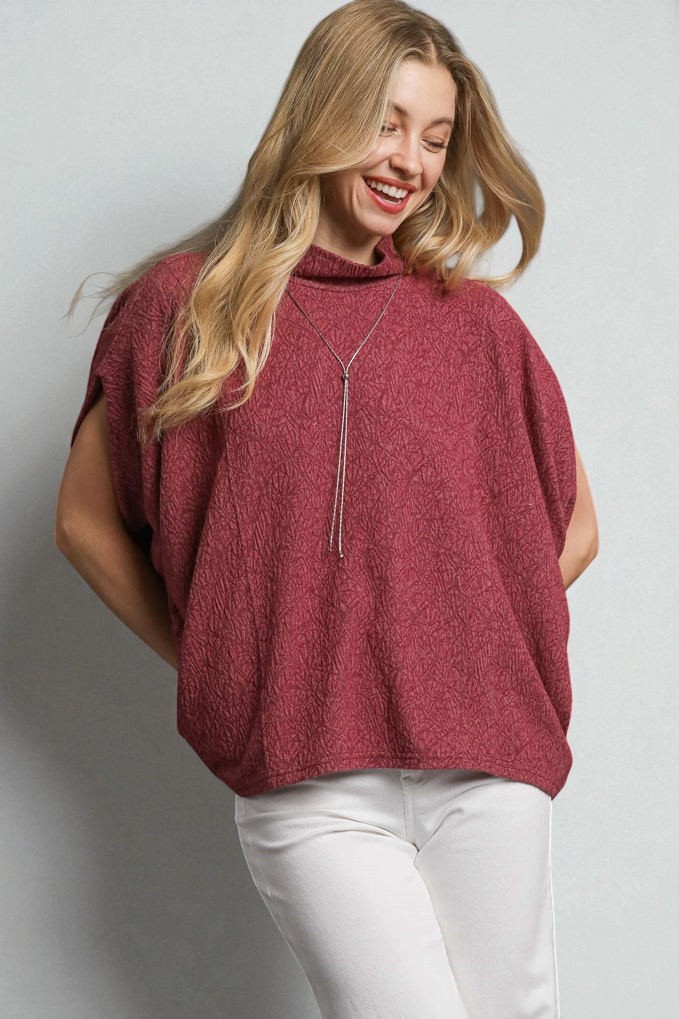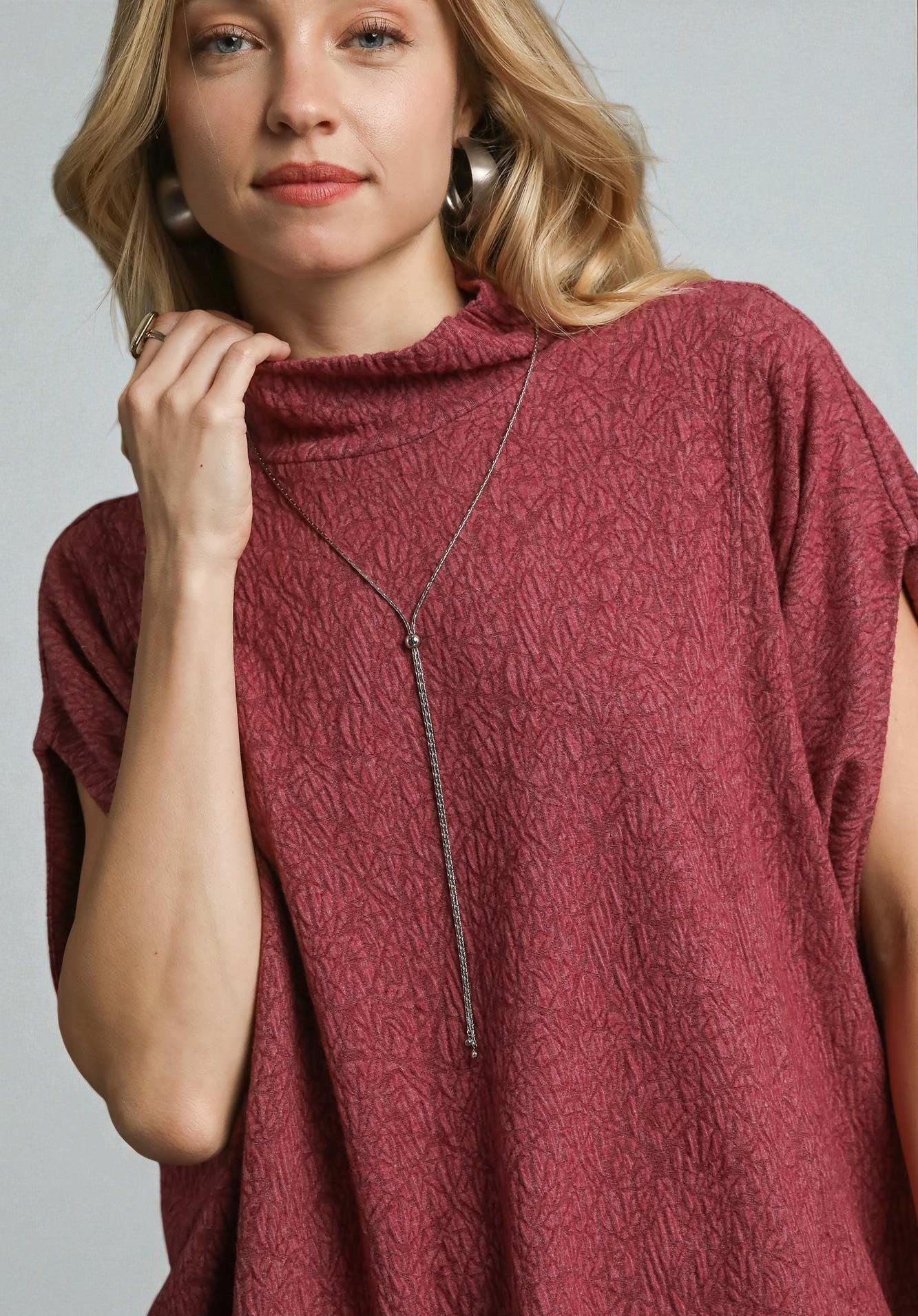 Effortlessly chic and oh-so-comfy, this wine-hued mock neck top is your new go-to for laid-back style. The textured fabric adds visual interest while the relaxed fit lets you move freely—perfect for everything from coffee runs to casual hangouts. Short sleeves keep things breezy without sacrificing that cozy mock neck vibe.