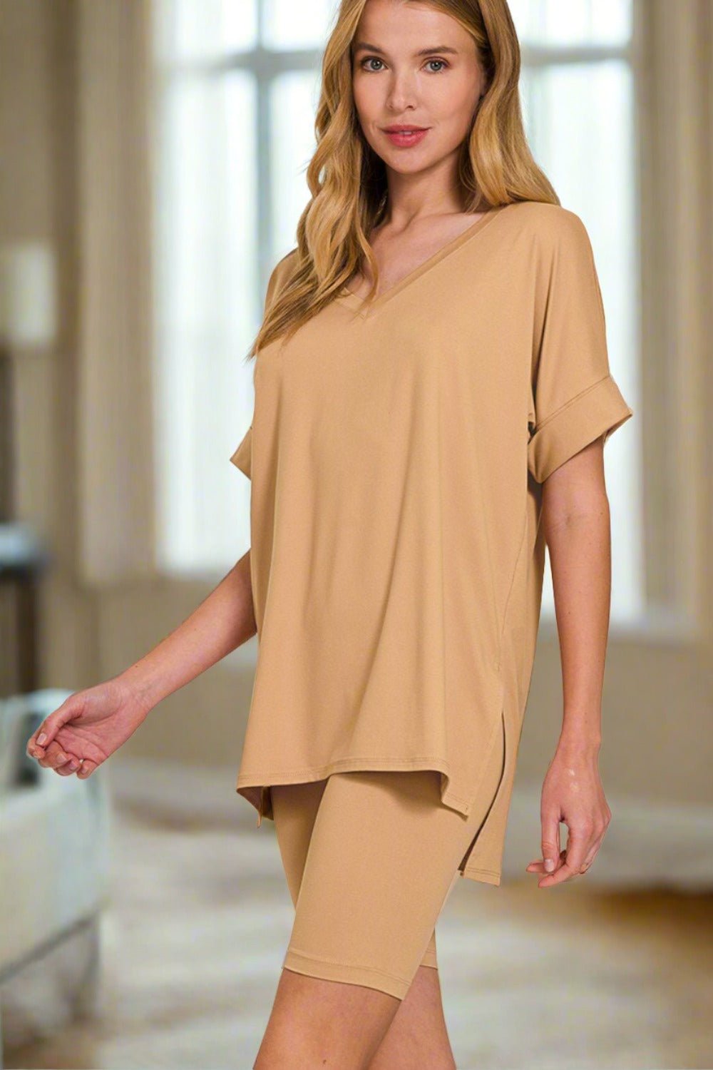 Throw on this laid-back combo and you're basically ready for anything—brunch, errands, or just vibing at home. The oversized tee hits that sweet spot between cozy and chic, while the bike shorts keep things practical without sacrificing style. Camel's that neutral that plays nice with everything in your closet, making this set your new go-to for effortless days. Comfort meets cool in one easy pairing.