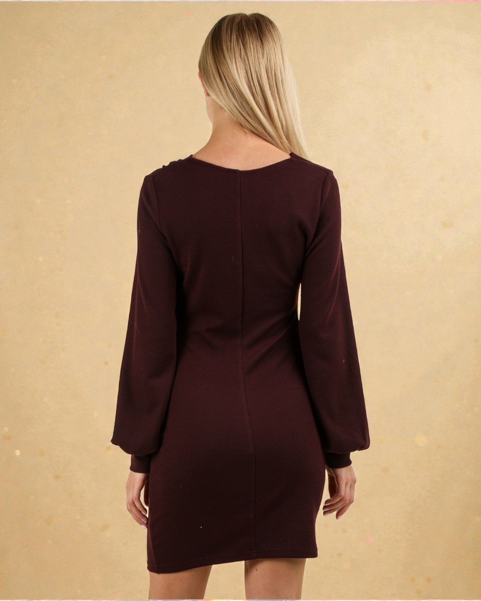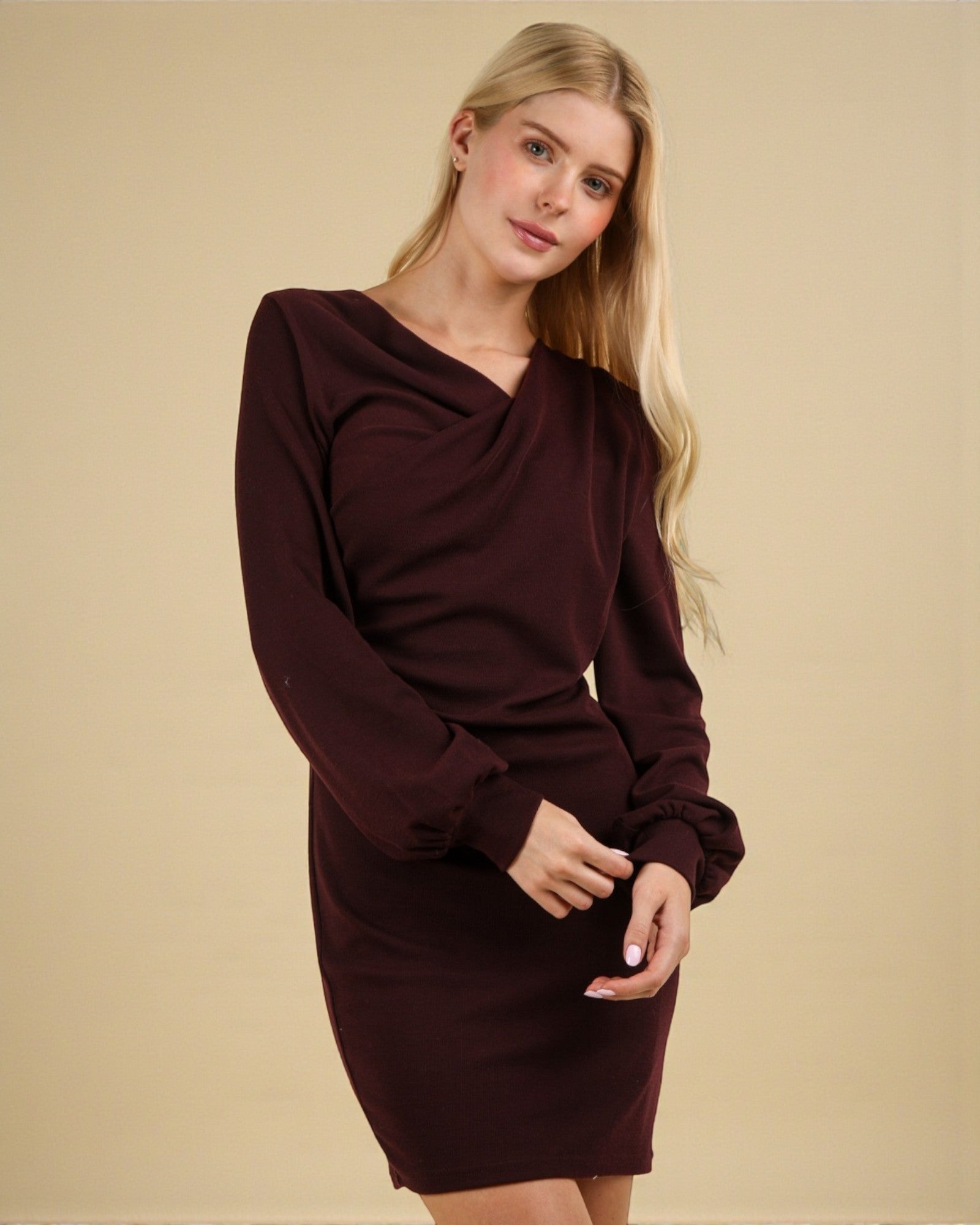 Wrap yourself in effortless elegance with this burgundy mini dress that's equal parts chic and comfortable. Crafted from a soft cotton blend, the long sleeves provide just the right amount of coverage while the flattering wrap-front silhouette creates a polished, put-together look.