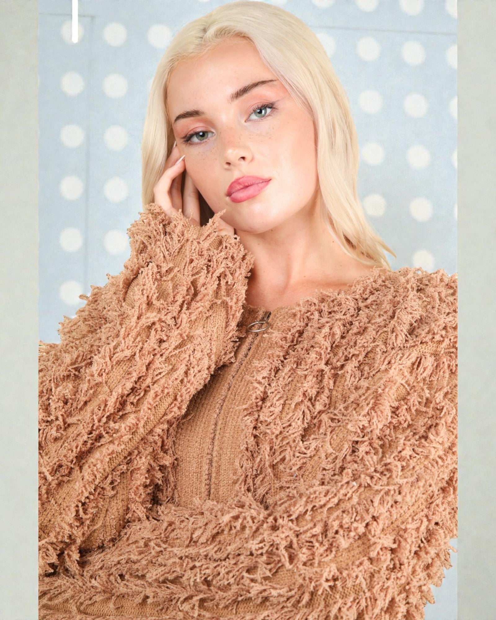 Snuggle up in this soft blush shag knit cardigan and let the cozy vibes take over. With its plush, textured knit and easy zip-front closure, it's your new go-to for layering with personality. The dreamy blush hue brings a touch of romance to any outfit, while the shaggy texture adds that coveted tactile appeal.