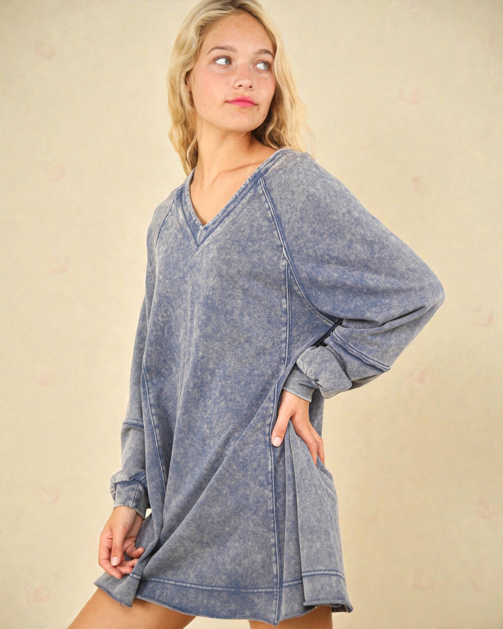 Slip into effortless style with this cotton blend mini dress that works harder than it looks. The v-neck and long sleeves give you that sweet spot between cozy and chic, while the soft, breathable fabric keeps you feeling great from morning to night. Perfect for layering over basics or standing solo—dress it down with sneakers or elevate it with your favorite accessories. Your new go-to for looking put-together without trying too hard.