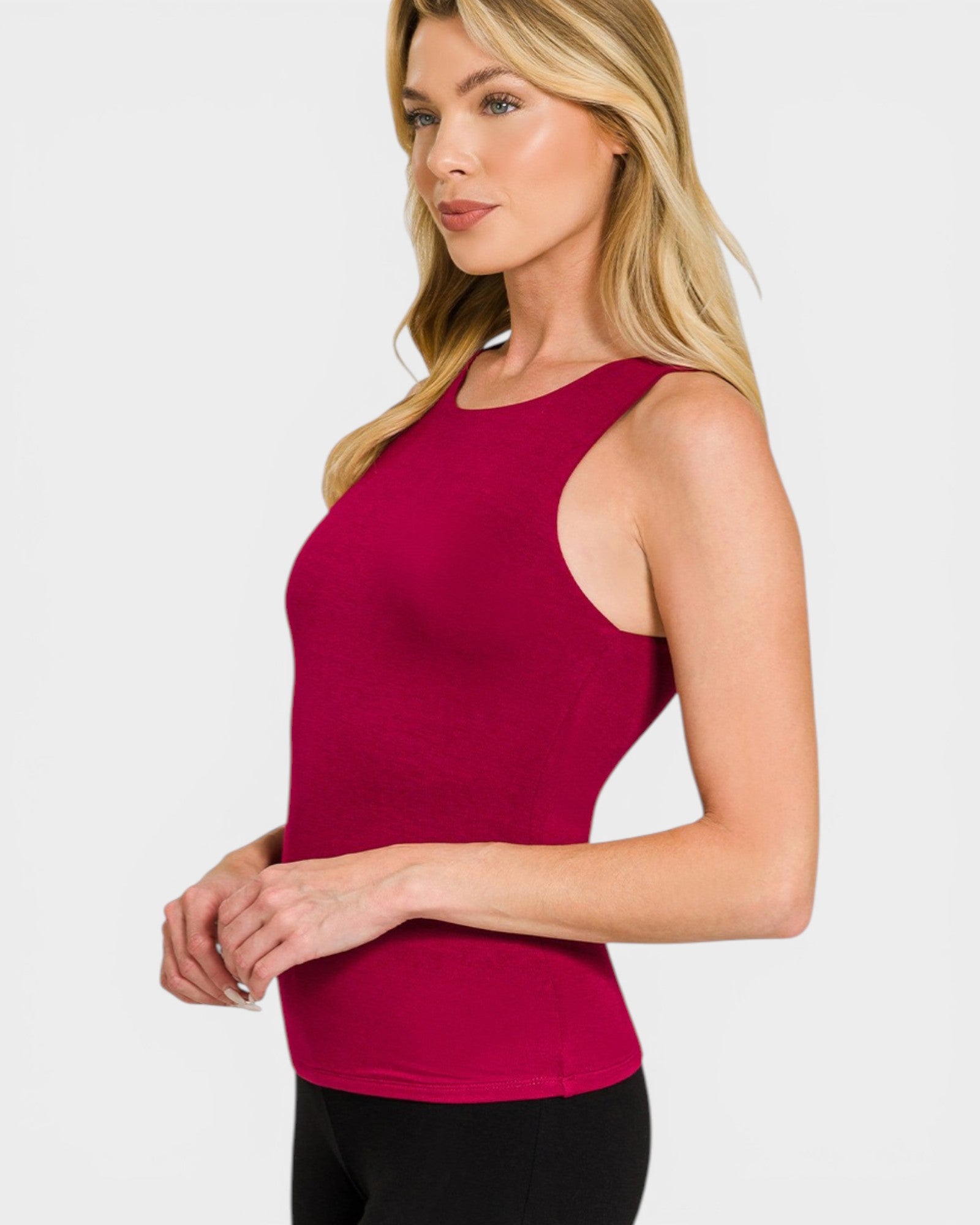 Clean, sleek, and endlessly versatile, this berry-hued sleeveless tank top features a smooth double-layer construction with a flattering fitted silhouette for a polished everyday look. The higher neckline gives it a modern, elevated feel, while the soft stretch knit keeps it comfortable and easy to wear on its own or layered. A timeless staple for denim, trousers, skirts, and year-round layering.