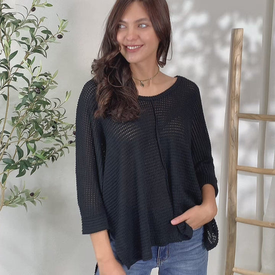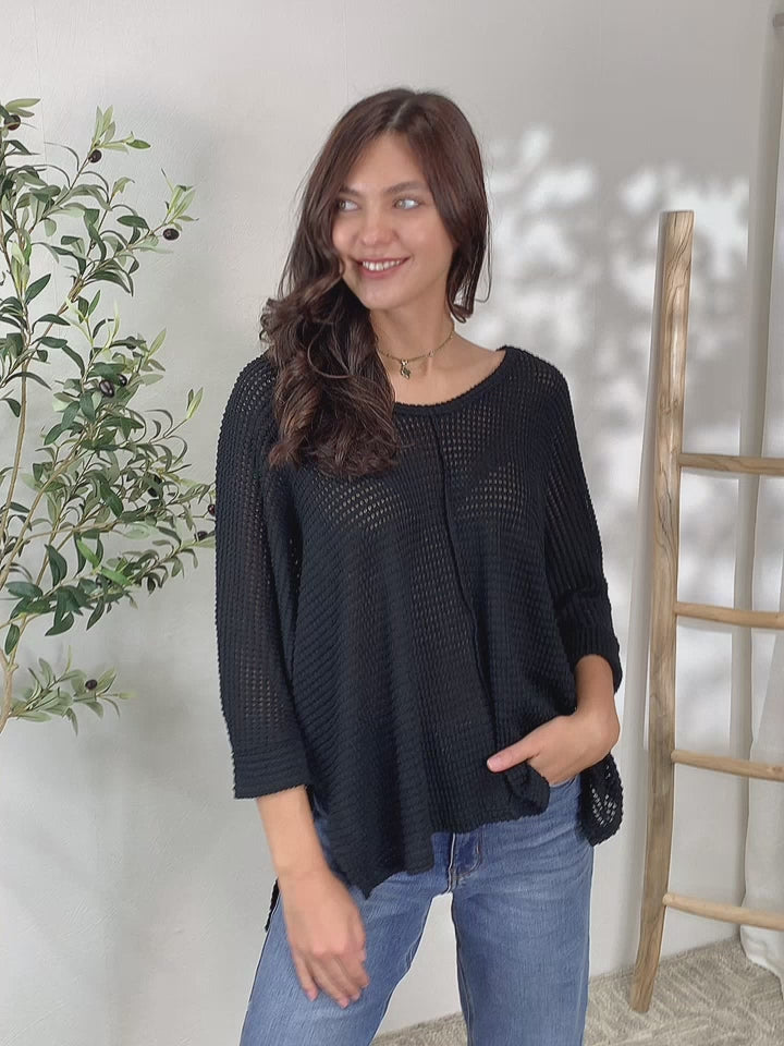 Effortlessly chic and undeniably comfy, this black waffle knit top is your new go-to for laid-back style. The oversized silhouette pairs perfectly with three-quarter dolman sleeves that drape just right, giving you that relaxed-yet-put-together vibe. Available in plus sizes, it's designed so everyone can rock this versatile piece.