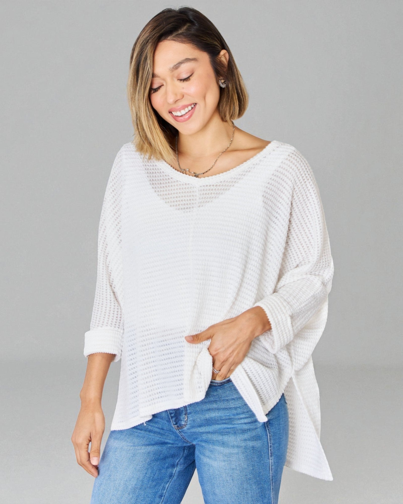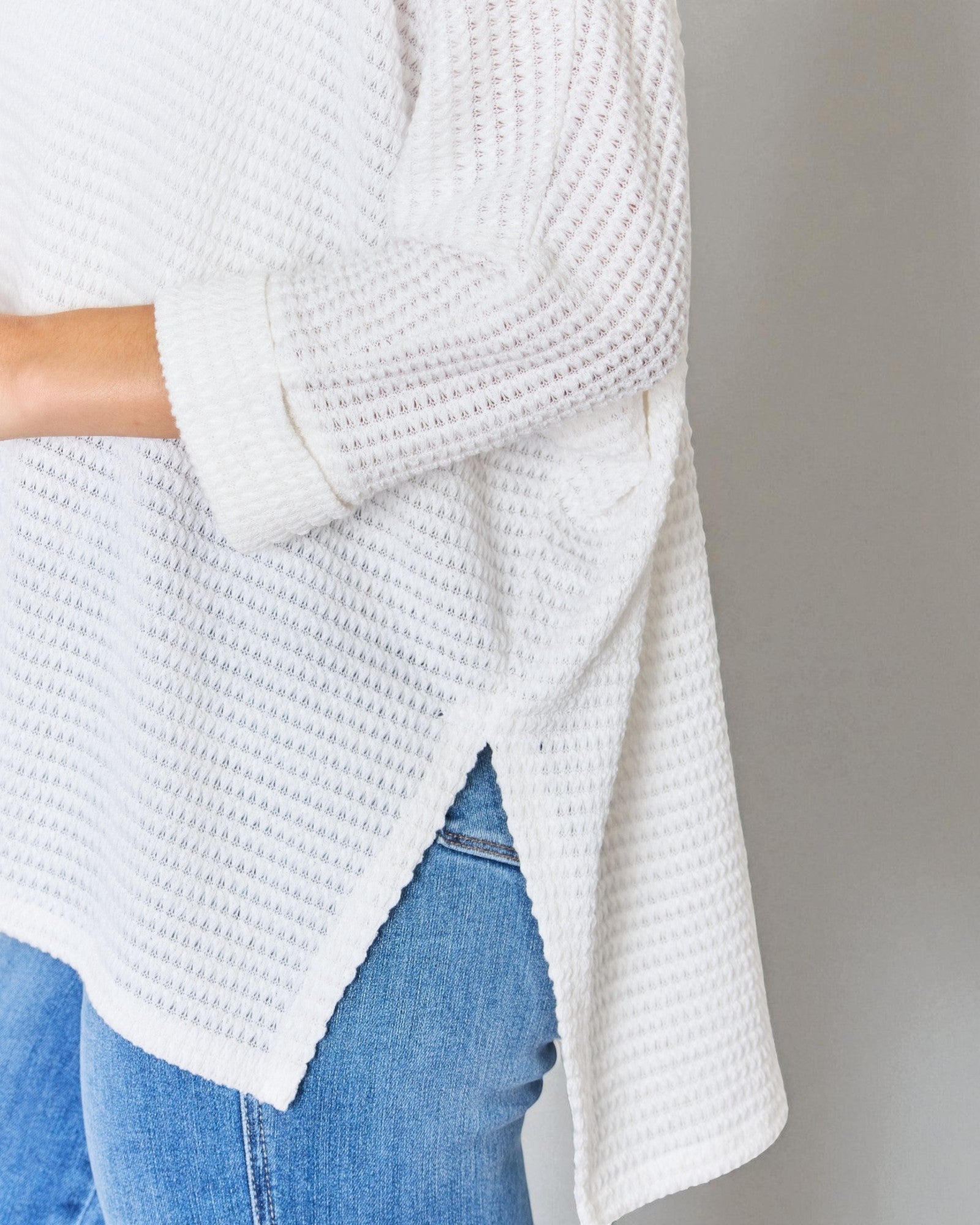 Cozy up in this effortlessly chic waffle knit sweater that's anything but basic. The oversized silhouette pairs perfectly with three-quarter sleeves for that relaxed, weekend-ready vibe, while the split hem adds a playful twist to a classic piece. Available in plus sizes so everyone can rock this comfy essential. Throw it on with your favorite jeans and you're golden.